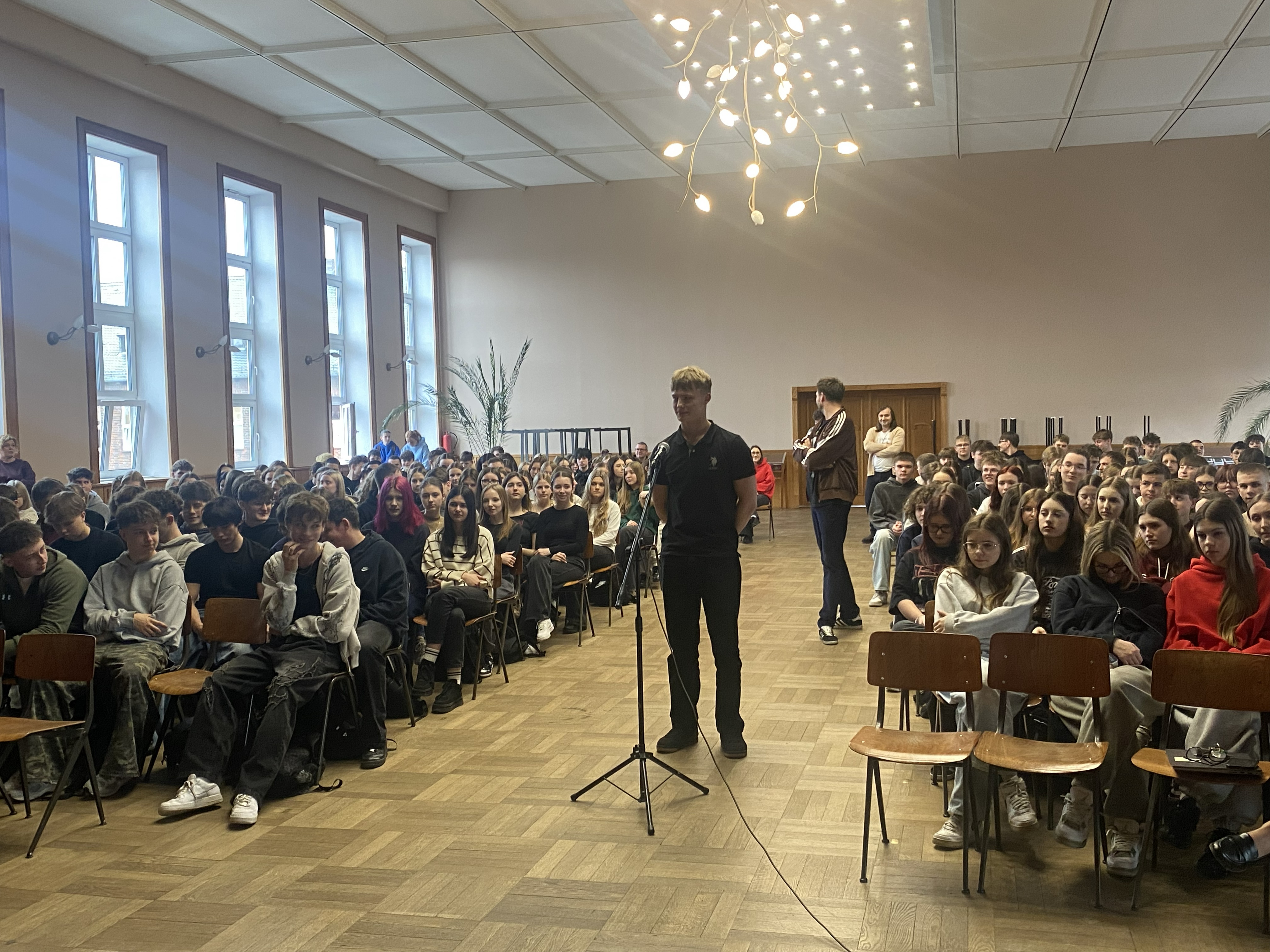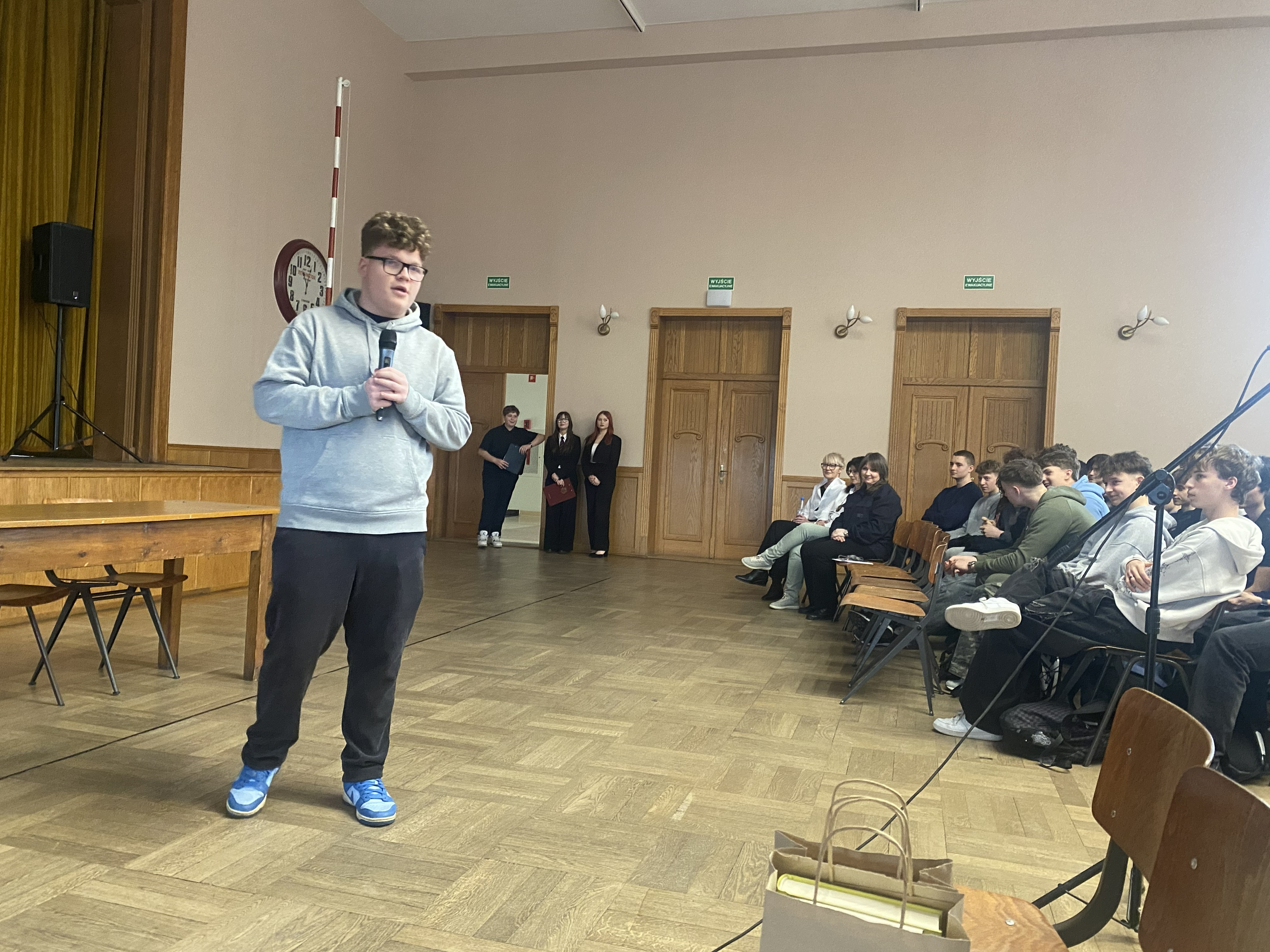 Spotkanie, w którym uczestniczyła cała społeczność szkolna rozpoczęło się od wystąpienia Huberta Utrajczyka. Następnie oddał głos kandydatom na przewodniczącego SU czyli Maciejowi Jankowskiemu, Gabrieli Ślosarczyk oraz Mai Wojciechowskiej. Każdy z nich miał niełatwe zadanie zaprezentować nie tylko swoja osobę, ale przede wszystkim wizję przyszłych działań na rzec społeczności szkolnej oraz przekonać do swojej kandydatury słowem i właściwą postawą. Obecny przewodniczący z typową sobie energią przeprowadził młodszych kolegów przez meandry autoprezentacji oraz pytań z sali dotyczących chociażby wskazania swoich mocnych stron i zasobów czy doprecyzowania planów wyborczych.