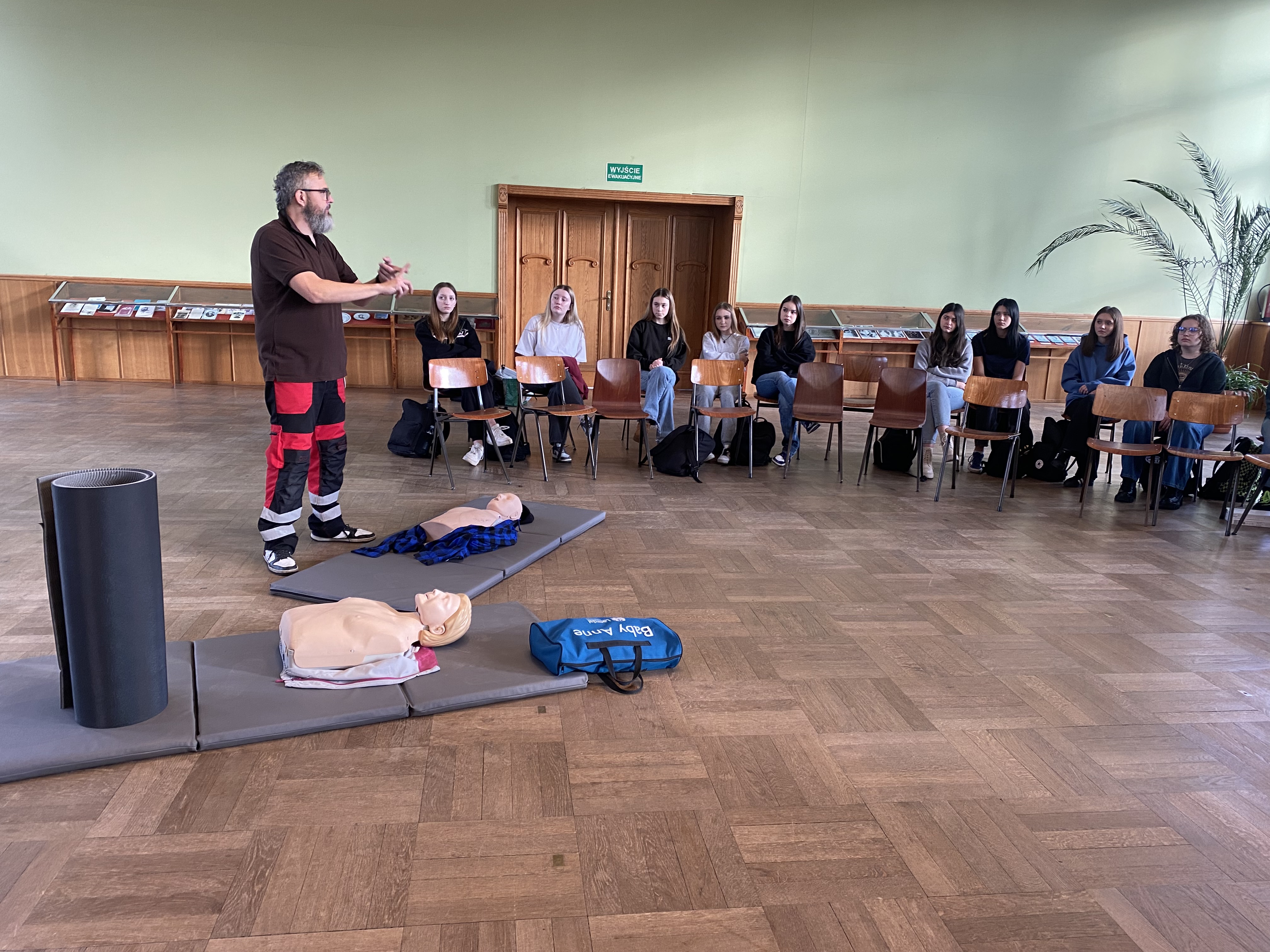 Młodzież dowiedziała się, że pokazywane przez ratownika czynności zwiększają szanse na uratowanie zdrowia, a nawet życia poszkodowanego. Dzięki prawidłowo wykonanemu masażowi serca szanse na przeżycie wzrastają dwukrotnie. Po przyswojeniu fachowej wiedzy i profesjonalnym pokazie Pana Łukasza, młodzież przystąpiła do ćwiczeń praktycznych.