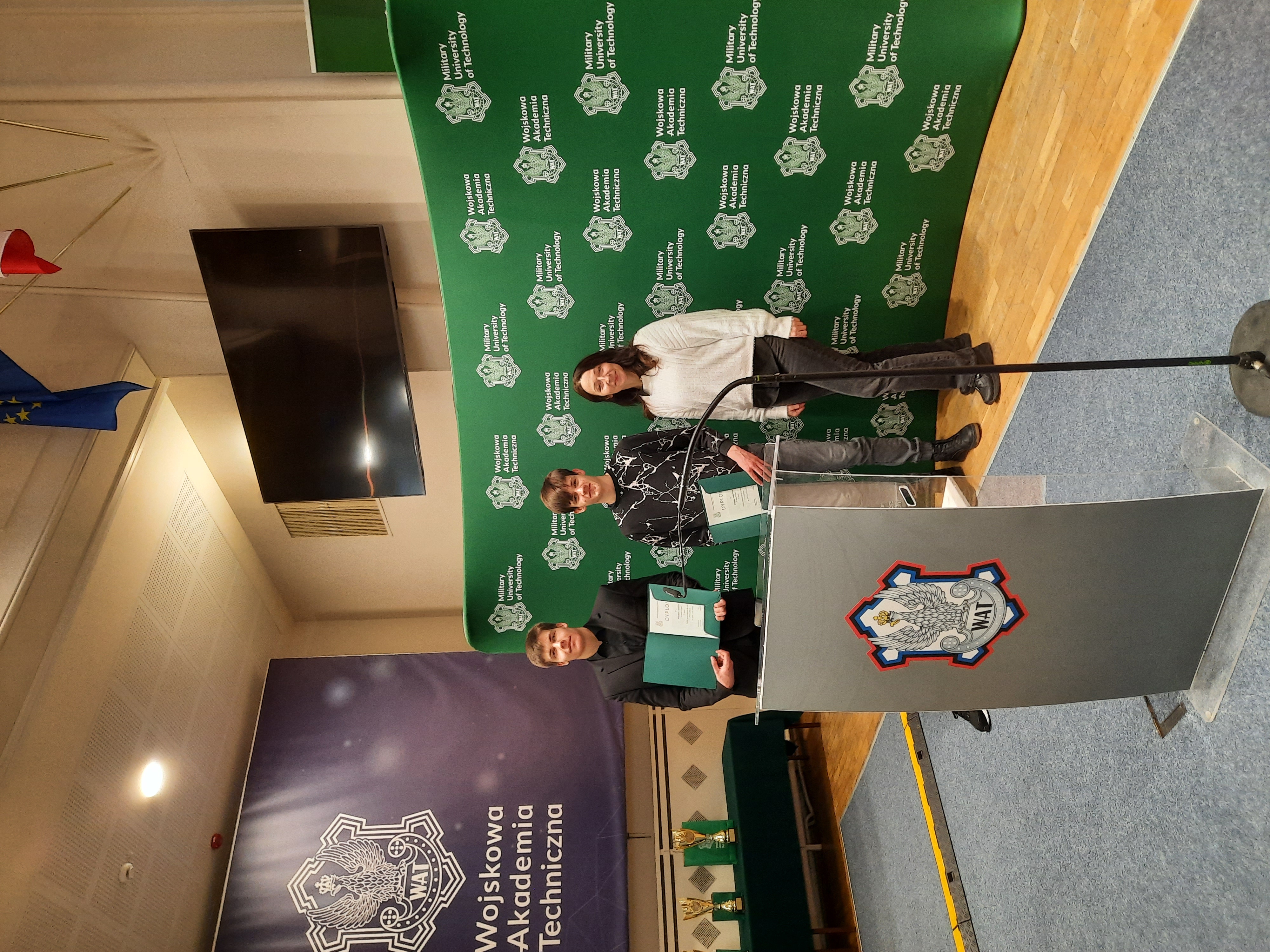 Uczniowie mieli również okazję zwiedzić Akademię Wojskową oraz Klub WAT, poznając bliżej infrastrukturę uczelni i jej tradycje. Program finału wzbogaciły interesujące wykłady, a całość została zorganizowana na najwyższym poziomie, z przerwą obiadową dla uczestników oraz licznymi momentami na kawę i słodkie przekąski. Po obiedzie ogłoszono wyniki i zostały wręczone nagrody. Patryk i Mikołaj otrzymali zaszczytne dyplomy finalisty, jednak nie udało im się zdobyć tytułu laureata.