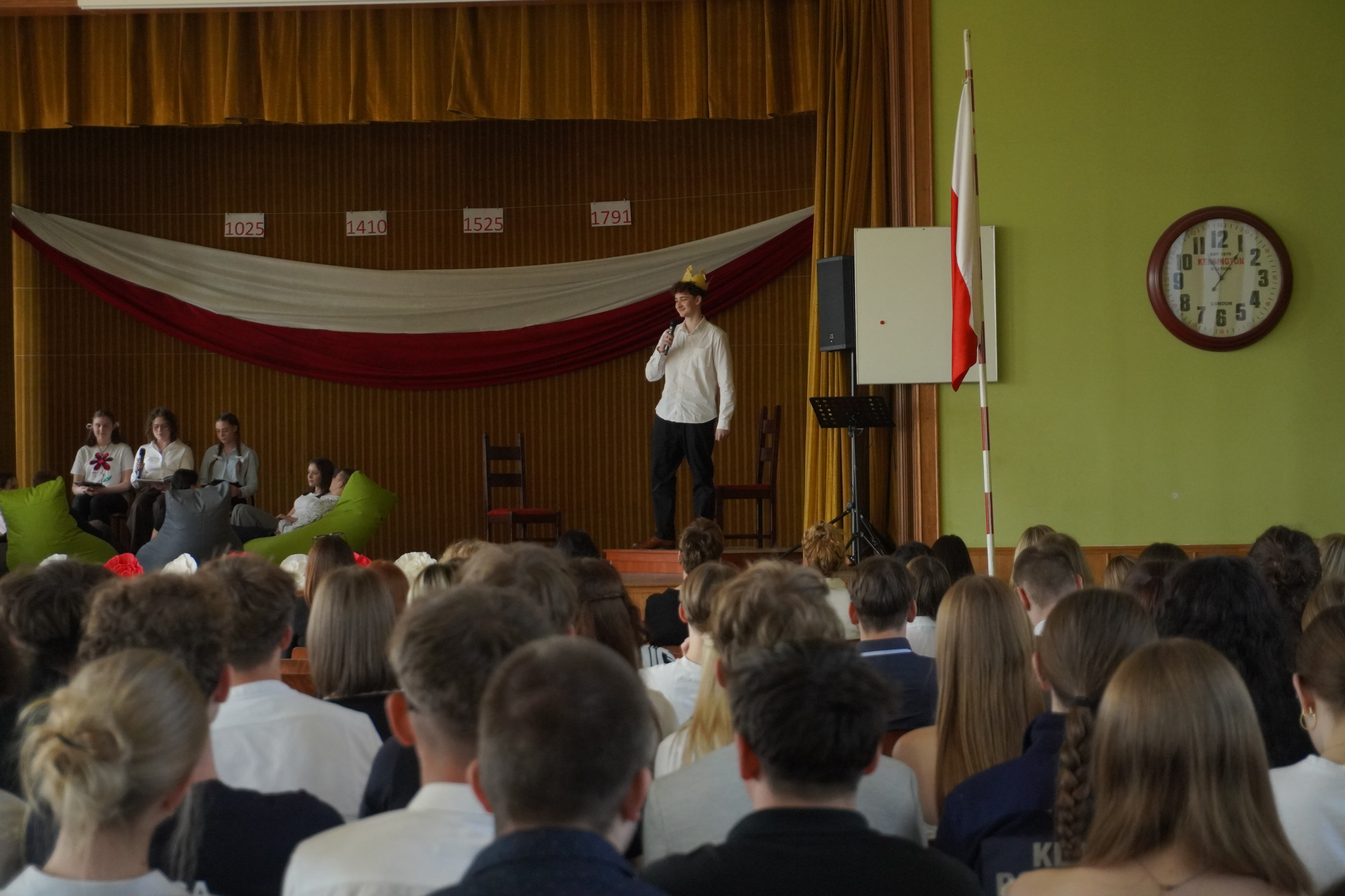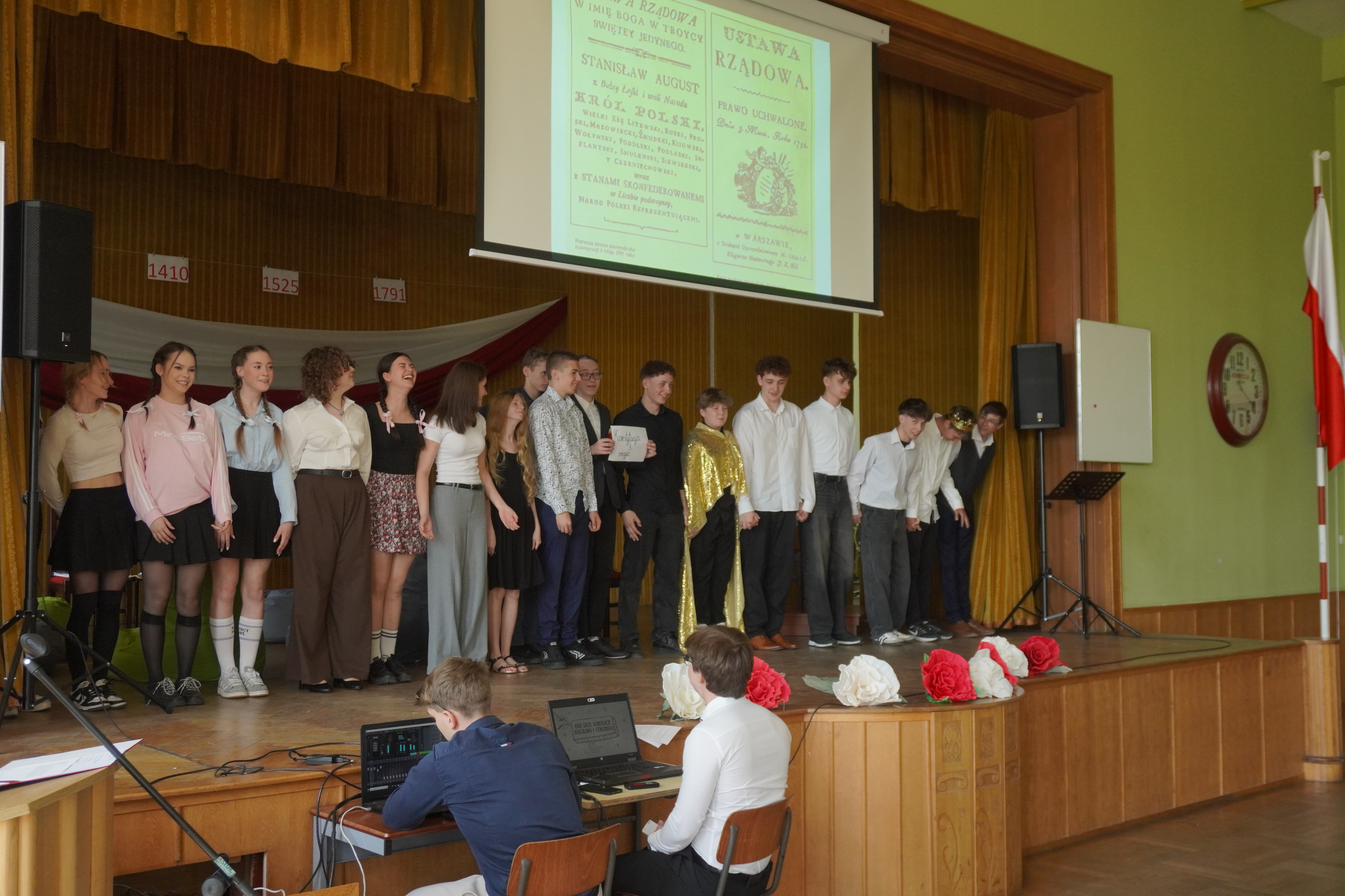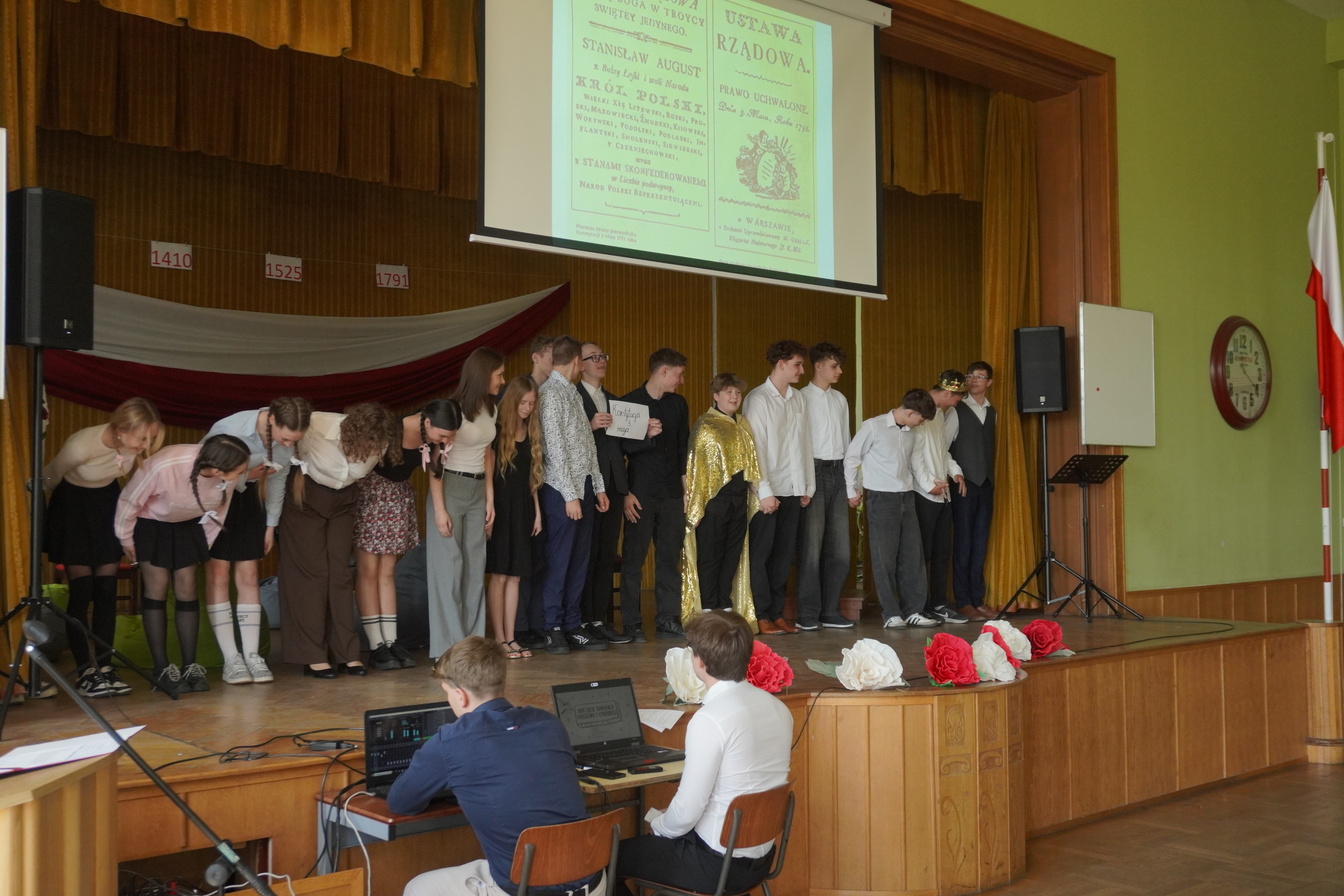 Uroczystość rozpoczęliśmy Hymnem Narodowym, w obecności Pocztu Sztandarowego i Pocztu Flagowego. W części artystycznej – przygotowanej przez p. Tomasza Woźniczkę - uczniowie klasy 2A przedstawili opowieść o dziejach Polski od roku 1000-go do czasów Sejmu Wielkiego, przeplataną scenkami historycznymi. Apel uświetniła swoim pięknym głosem Małgorzata Gołębiowska śpiewając utwór „Smutno mi Boże”. Podczas apelu uczciliśmy również jubileusz 1000- lecia Królestwa Polskiego, prezentując wyniki pracy na konkurs historyczny - komiks o koronacji Bolesława Chrobrego. Zespół z klasy 2A zdobył 3 miejsce w tym konkursie. W trakcie uroczystości Pani Dyrektor Magdalena Mielczarek wręczyła gratulacje i podziękowania p. Dorocie Giezek, za przygotowanie i przeprowadzenie lekcji otwartej o CERN. Ogłoszone zostały również wyniki konkursu na pracę artystyczną „Śladami CERN”. W konkursie tym I miejsce zdobyła Zuzanna Uba z klasy 3b. Na zakończenie uroczystości odbył się internetowy quiz o wydarzeniach historycznych związanych z tematyka apelu, który wygrała klasa 1A. Obchody Święta 3 Maja w naszej szkole pokazały, że młode pokolenie potrafi z dumą i zaangażowaniem uczestniczyć w budowaniu świadomości historycznej i patriotycznej.
