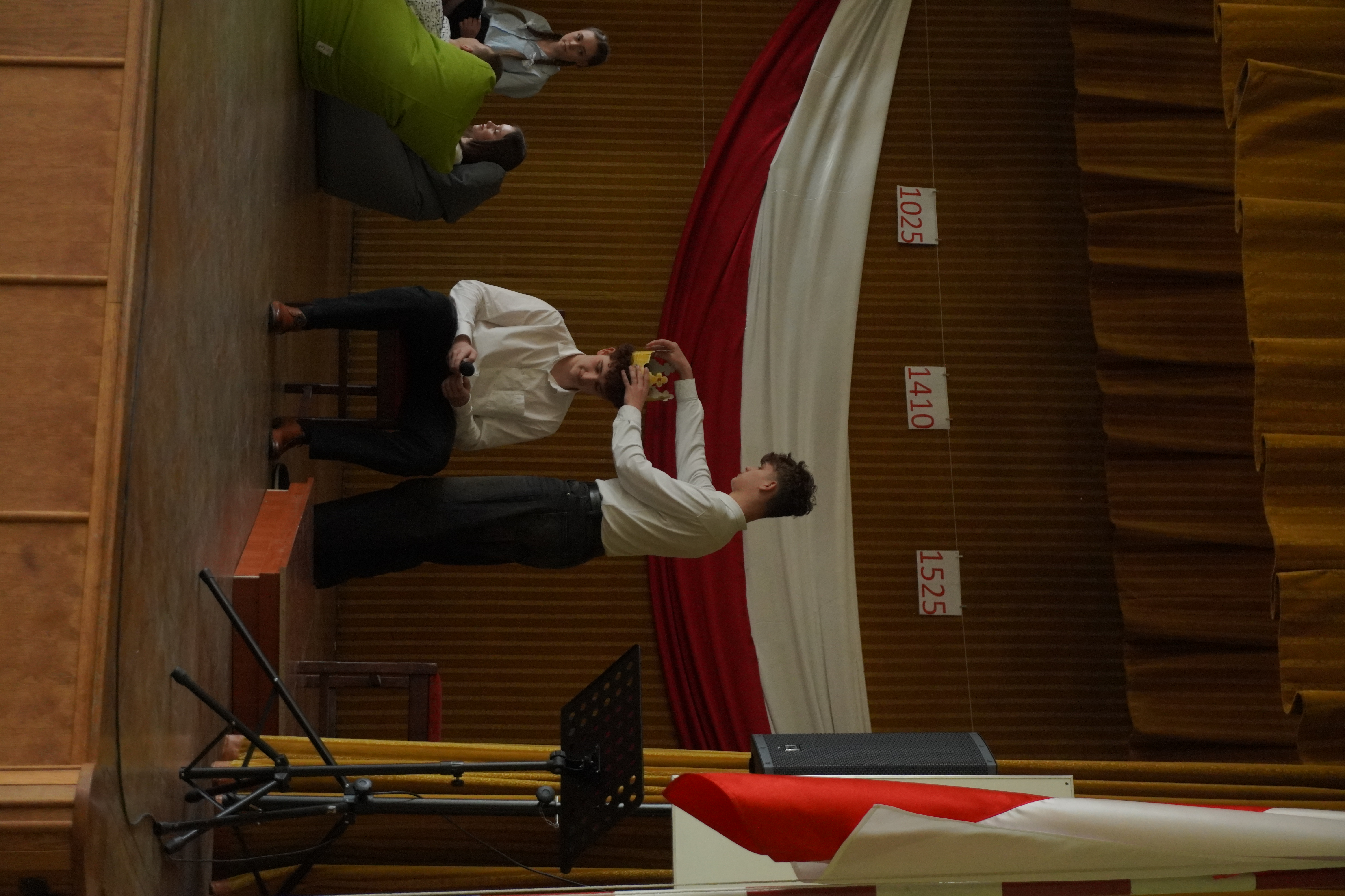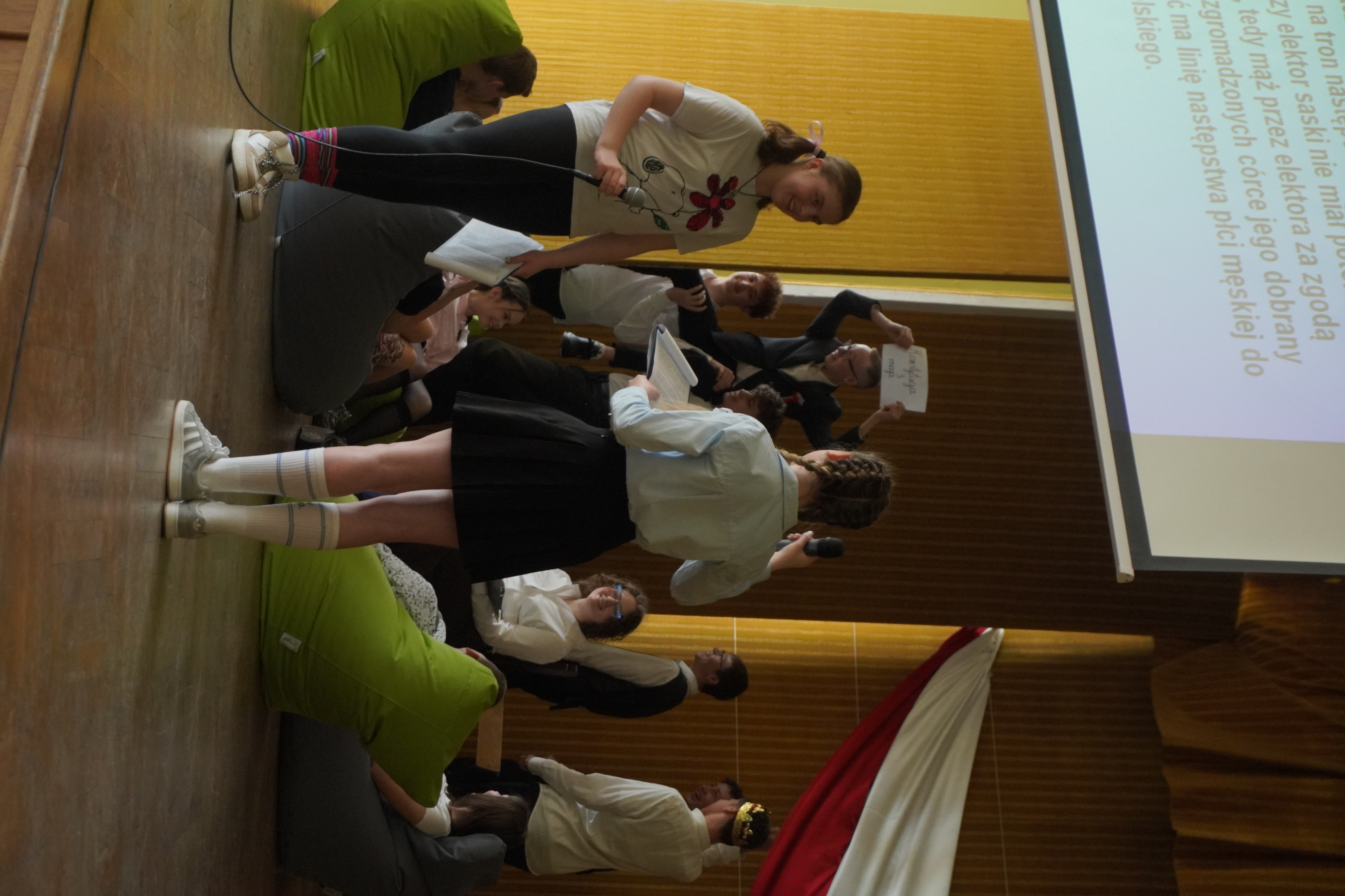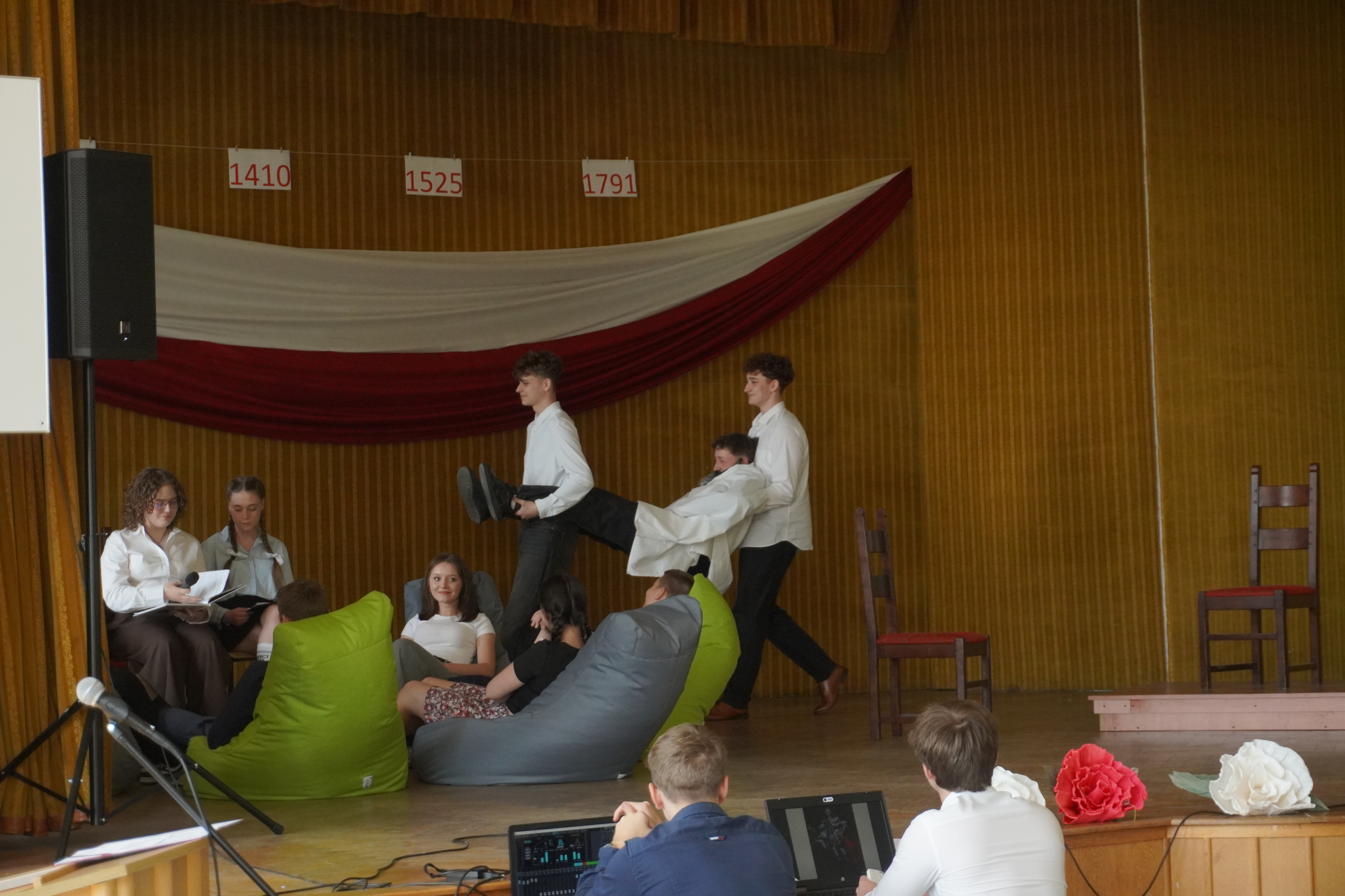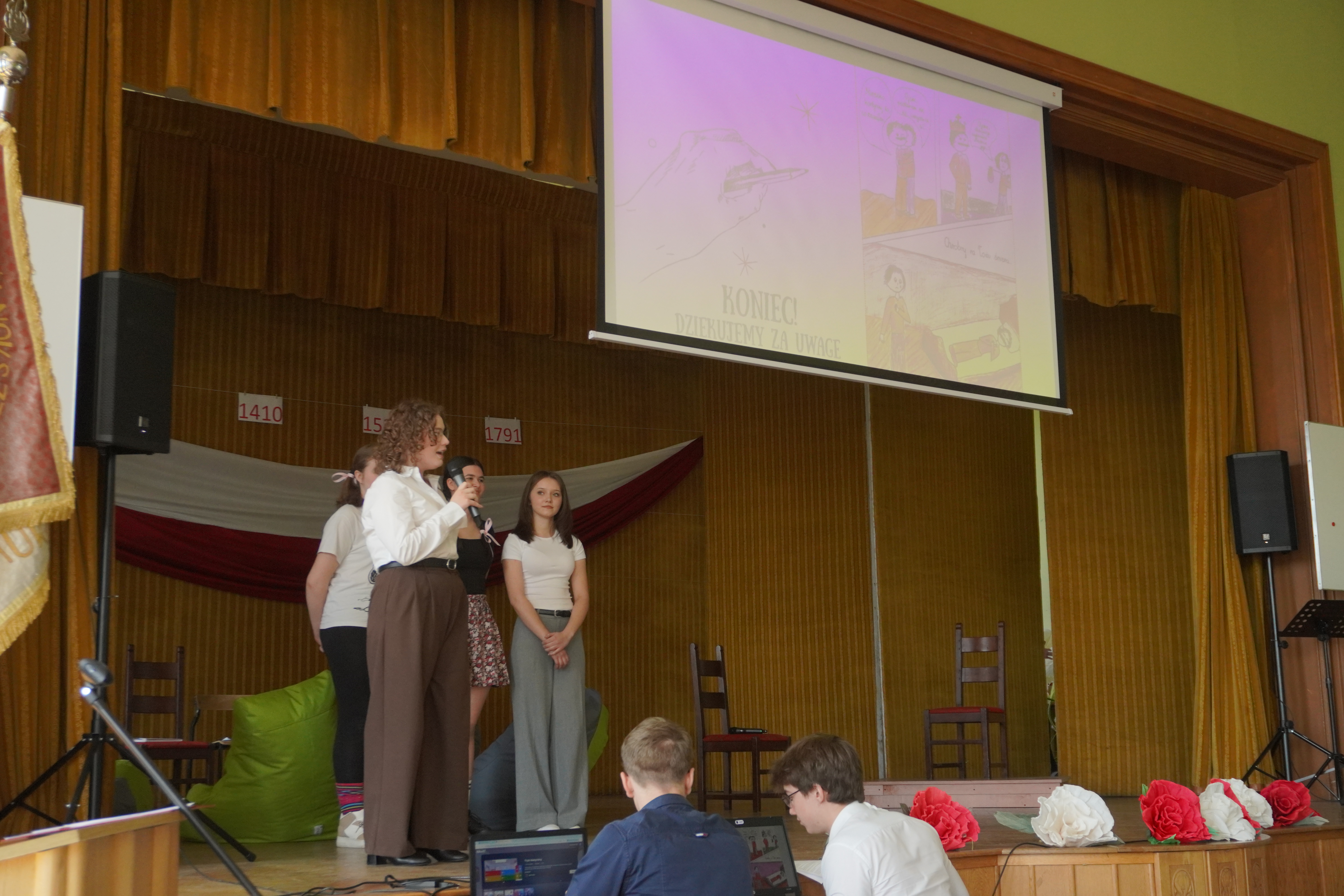Uroczystość rozpoczęliśmy Hymnem Narodowym, w obecności Pocztu Sztandarowego i Pocztu Flagowego. W części artystycznej – przygotowanej przez p. Tomasza Woźniczkę - uczniowie klasy 2A przedstawili opowieść o dziejach Polski od roku 1000-go do czasów Sejmu Wielkiego, przeplataną scenkami historycznymi. Apel uświetniła swoim pięknym głosem Małgorzata Gołębiowska śpiewając utwór „Smutno mi Boże”. Podczas apelu uczciliśmy również jubileusz 1000- lecia Królestwa Polskiego, prezentując wyniki pracy na konkurs historyczny - komiks o koronacji Bolesława Chrobrego. Zespół z klasy 2A zdobył 3 miejsce w tym konkursie. W trakcie uroczystości Pani Dyrektor Magdalena Mielczarek wręczyła gratulacje i podziękowania p. Dorocie Giezek, za przygotowanie i przeprowadzenie lekcji otwartej o CERN. Ogłoszone zostały również wyniki konkursu na pracę artystyczną „Śladami CERN”. W konkursie tym I miejsce zdobyła Zuzanna Uba z klasy 3b. Na zakończenie uroczystości odbył się internetowy quiz o wydarzeniach historycznych związanych z tematyka apelu, który wygrała klasa 1A. Obchody Święta 3 Maja w naszej szkole pokazały, że młode pokolenie potrafi z dumą i zaangażowaniem uczestniczyć w budowaniu świadomości historycznej i patriotycznej.