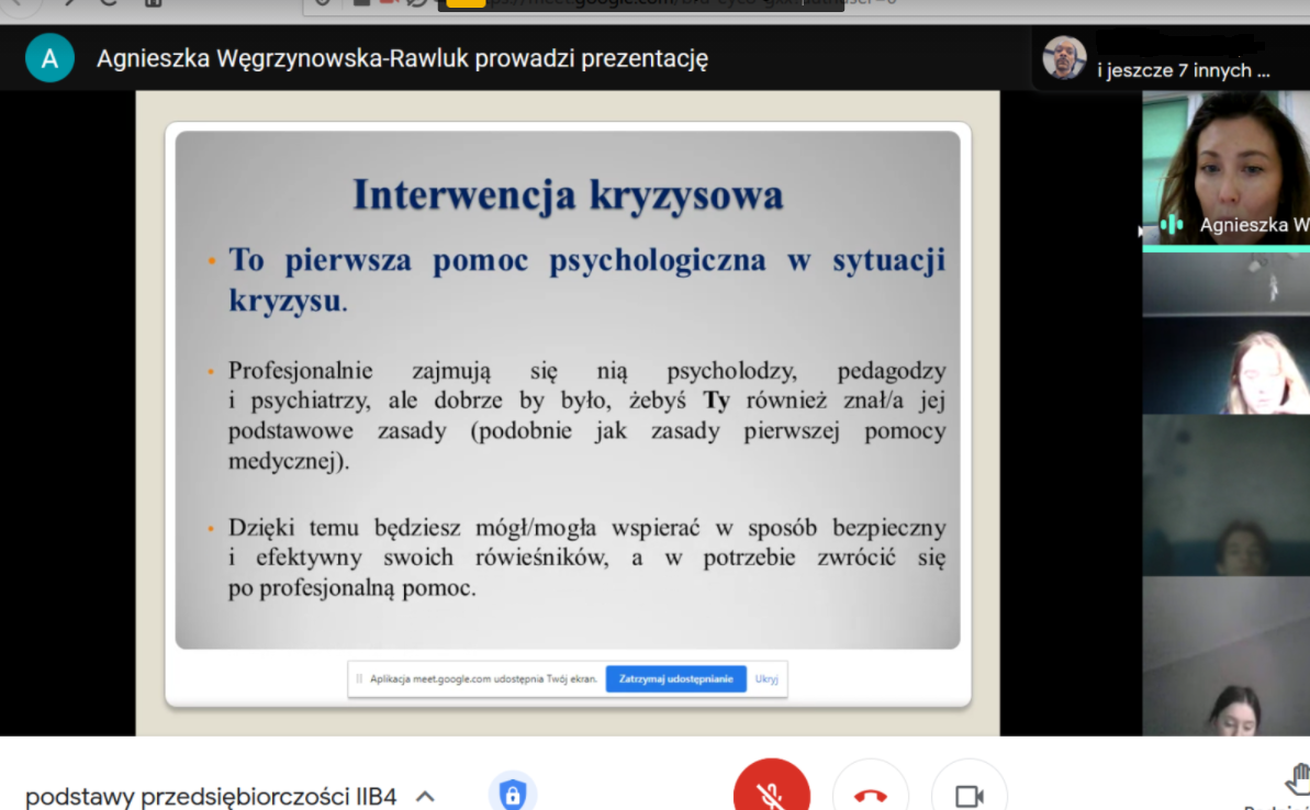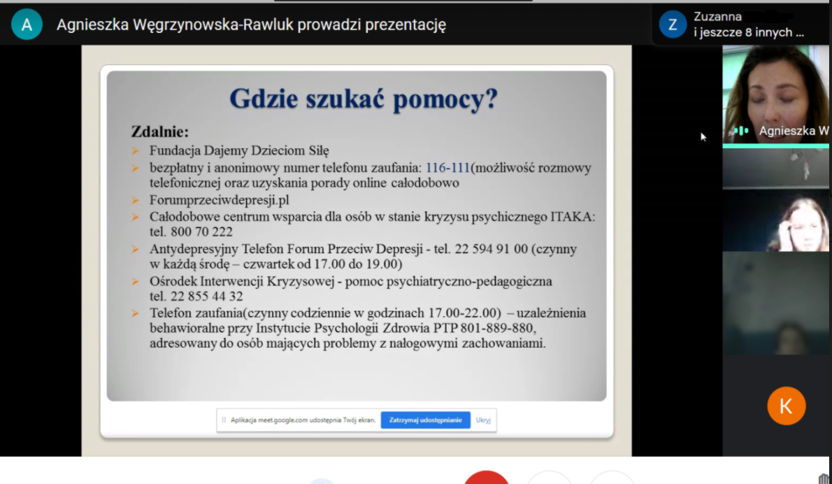 Konferencje on- line w dniu dzisiejszym rozpoczęła psycholog poradni Pani Agnieszka Węgrzynowska- Rawluk w klasach II. Pani psycholog poruszyła kwestie, iż sytuacja pandemiczna w kraju w dużym stopniu wpływa na nasilenie stanów lękowych wśród uczniów. Stale pogłębia poczucie wykluczenia, izolacji oraz samotności. Coraz częściej pojawiają się poważne zaburzenia depresyjne prowadzące do myśli samobójczych. W odpowiedzi na zgłaszane problemy młodzieży, spotkania online wyposażą uczniów w podstawową wiedzę niezbędną do udzielania pomocy osobie doświadczonej wydarzeniem kryzysowym.