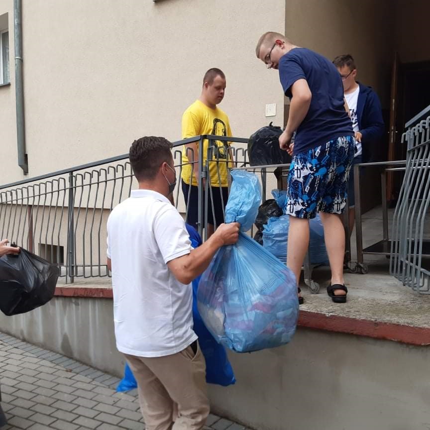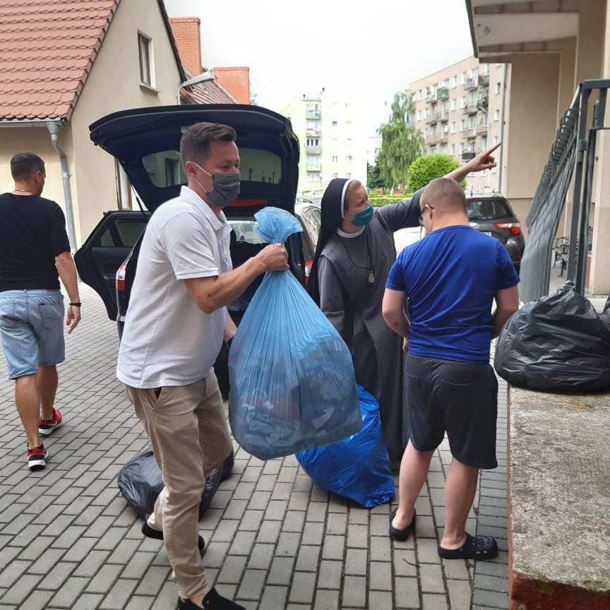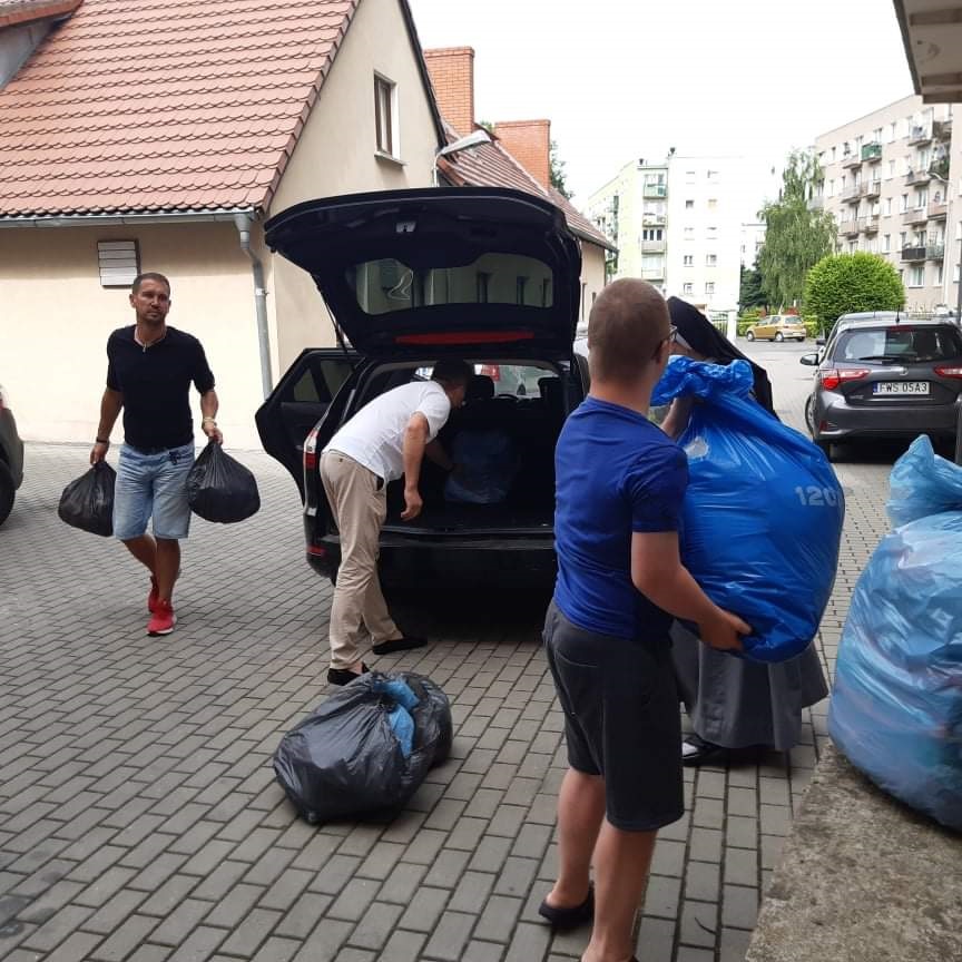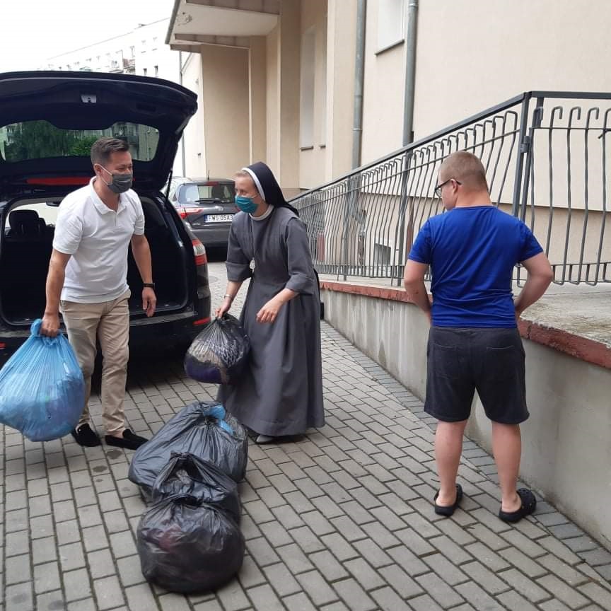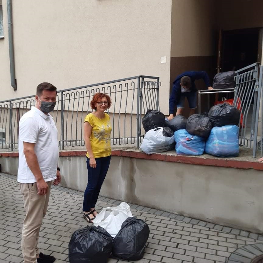 Delegacja szkoły w składzie : opiekunka Wolontariatu pani Irena Dziamarska , pan Maciej Kostyk oraz pan Mariusz Dziewic przekazali dary zebrane przez młodzież i pracowników szkoły w ostatnim roku.