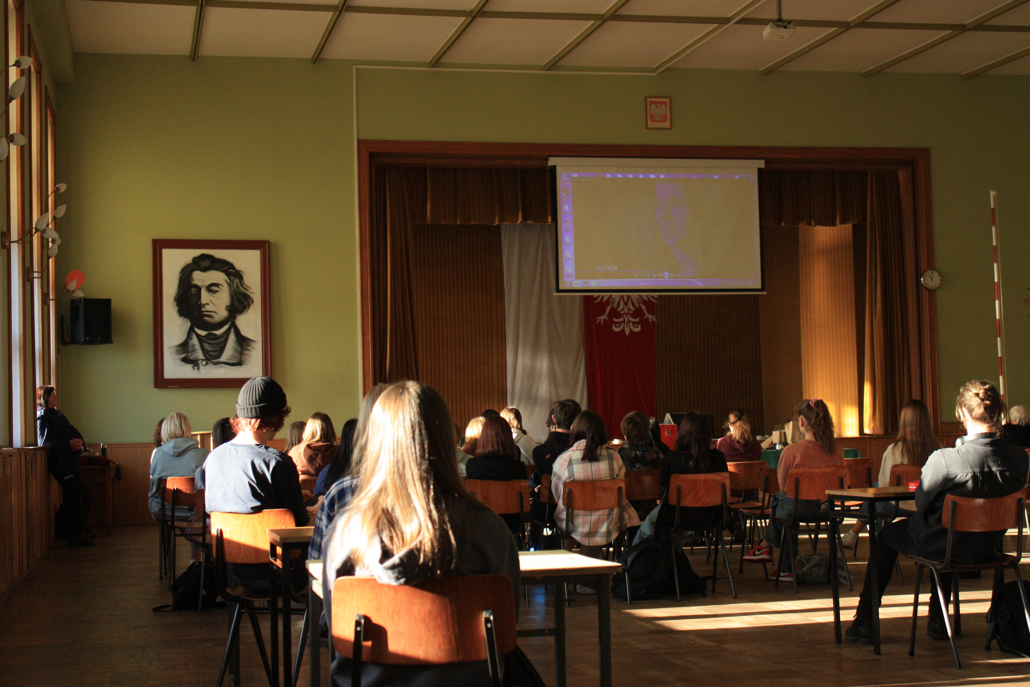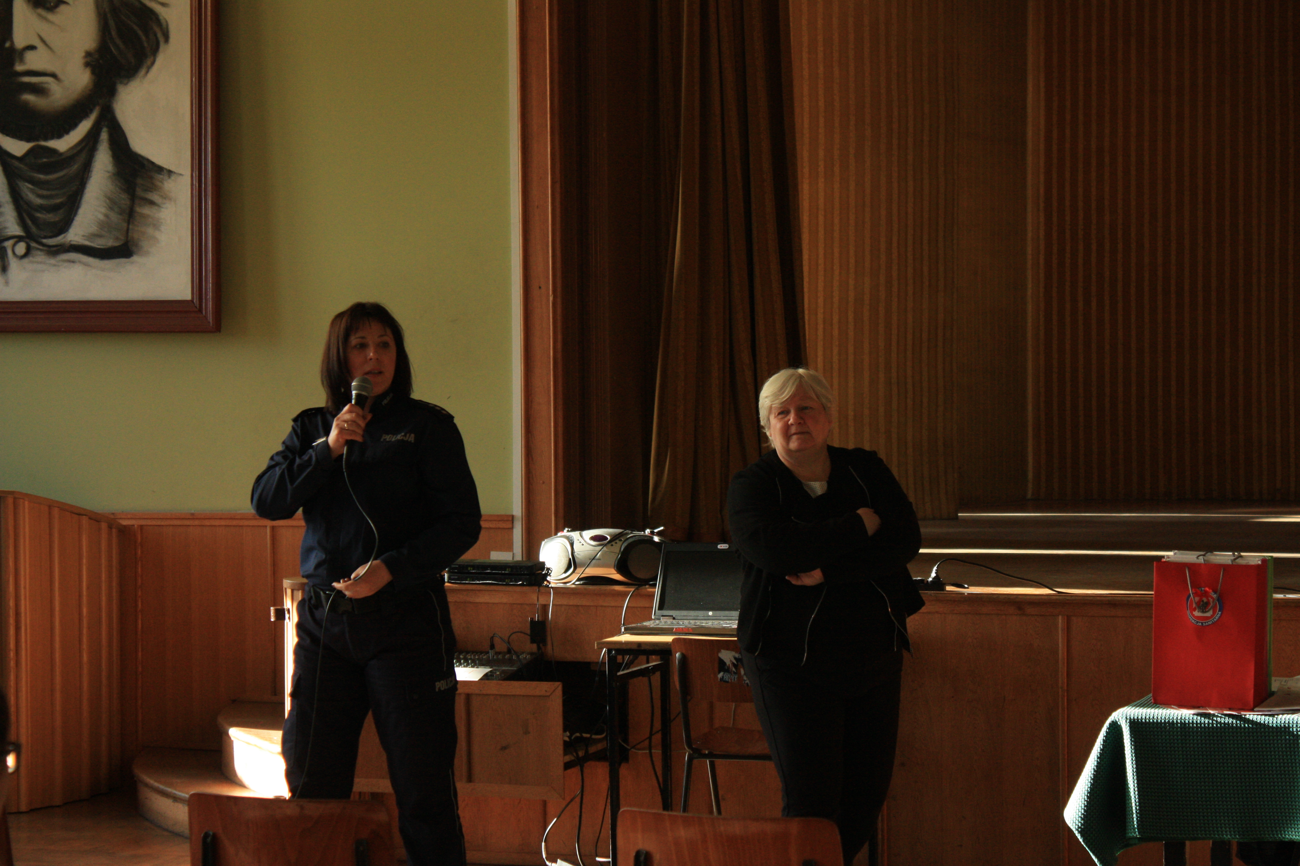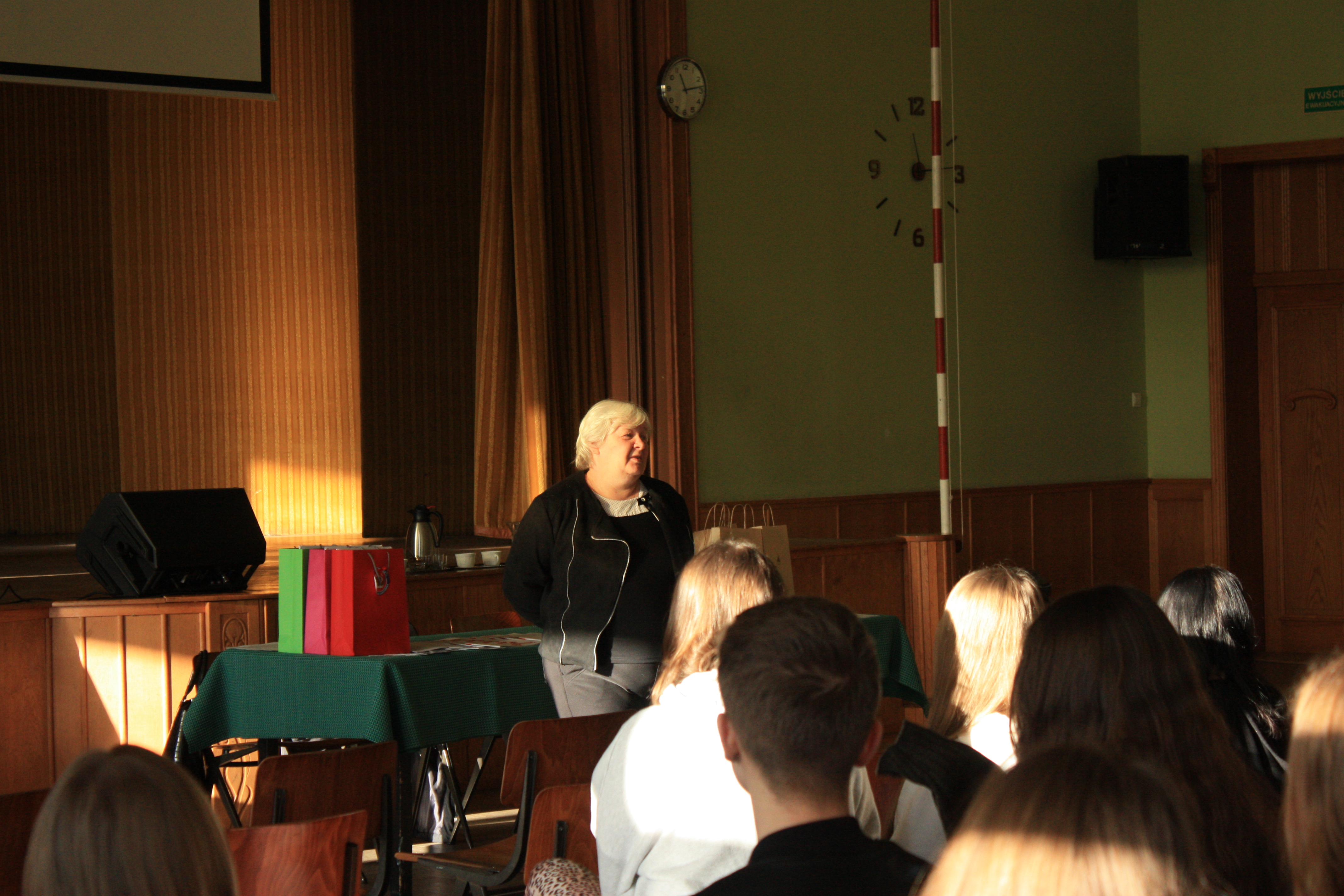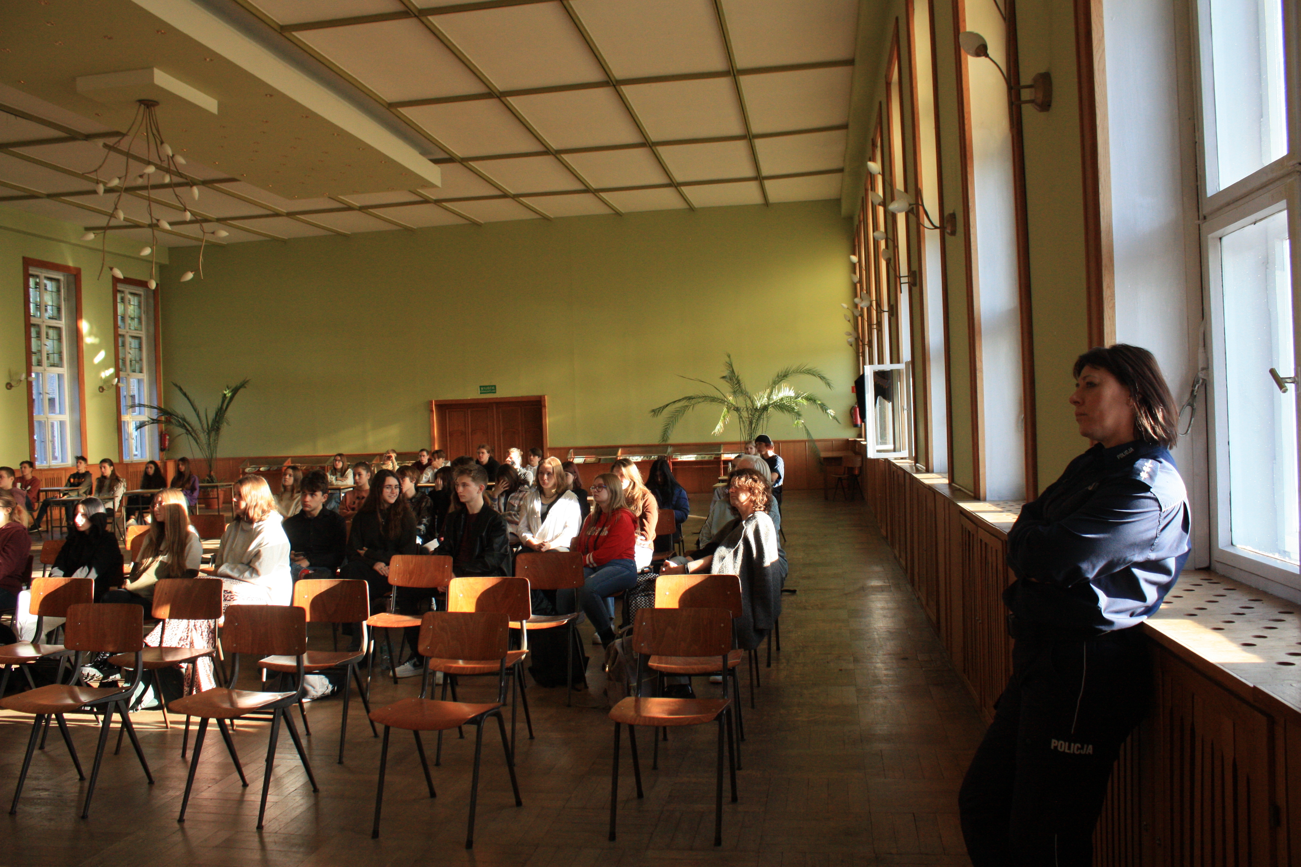 Młodzież klas pierwszych z uwagą wysłuchała wystąpień Inspektora ds. Uzależnień Pani Bogusławy Płaczek na temat uzależnień od środków psychoaktywnych oraz Starszego Aspiranta Pani Lidii Tarońt o cyberprzemocy i cyberzagrożeniach oraz odpowiedzialności nieletnich.