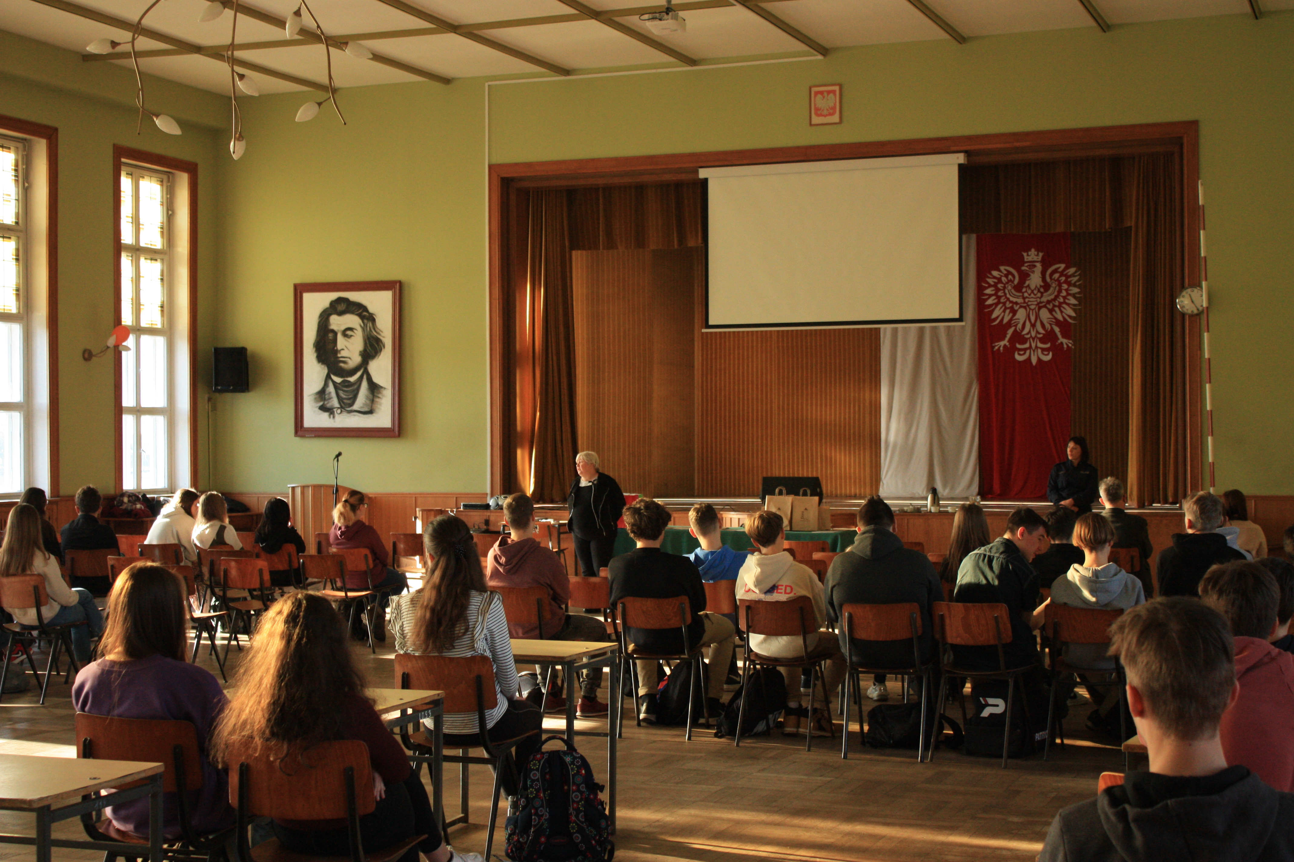 Następnie honorowi goście oraz uczniowie i uczennice pierwszych klas z nauczycielami zostali zaproszeni na panel profilaktyczny przygotowany we współpracy z Urzędem Miasta i Gminy w Górze i Komendą Powiatową Policji w Górze.