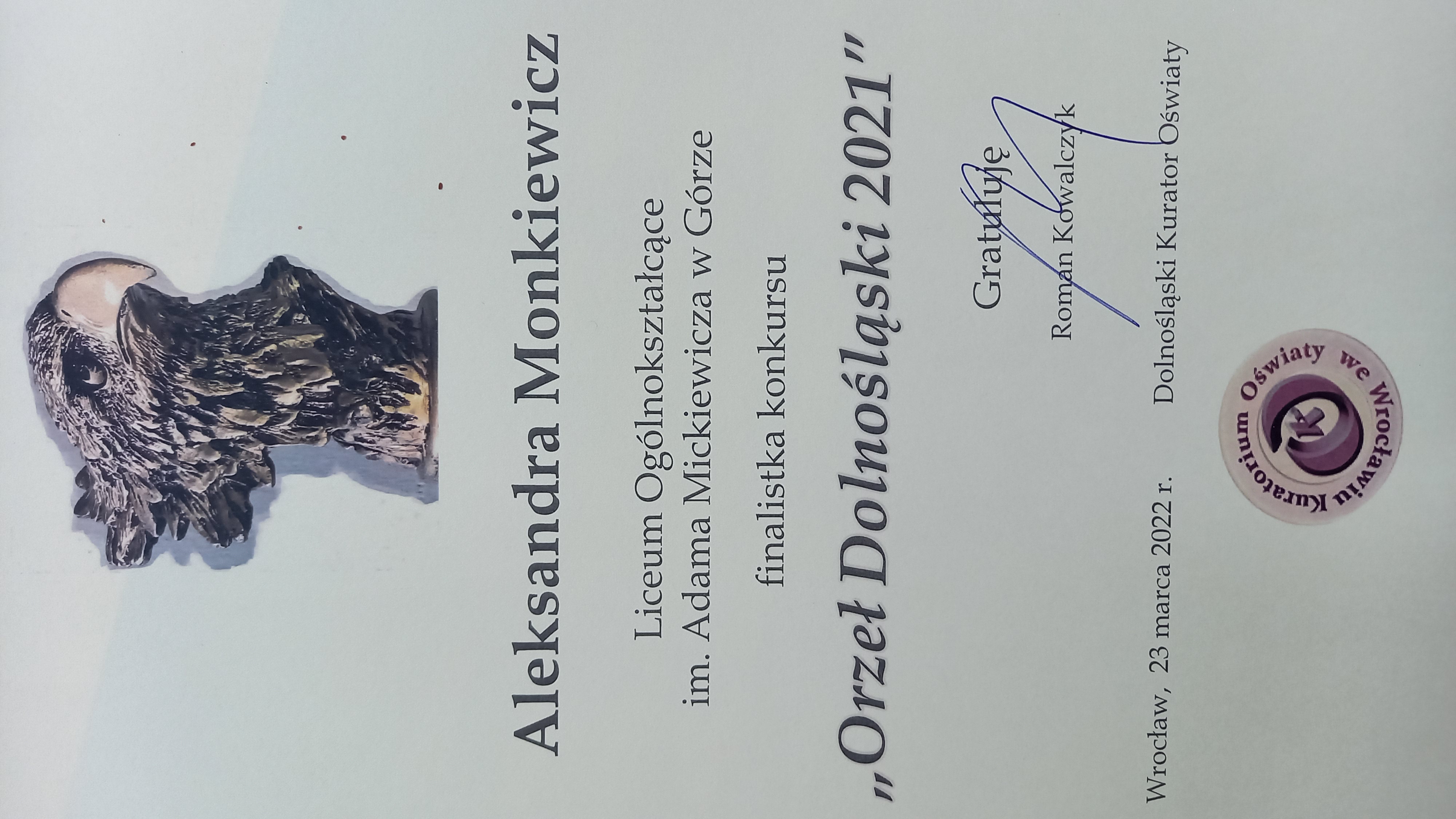 W październiku 2021 roku ze wszystkich nadesłanych wniosków Kapituła Konkursowa nominowała siedmioro uczniów, wśród których znalazła się Aleksandra Monkiewicz - uczennica Liceum Ogólnokształcącego im. Adama Mickiewicza w Górze.