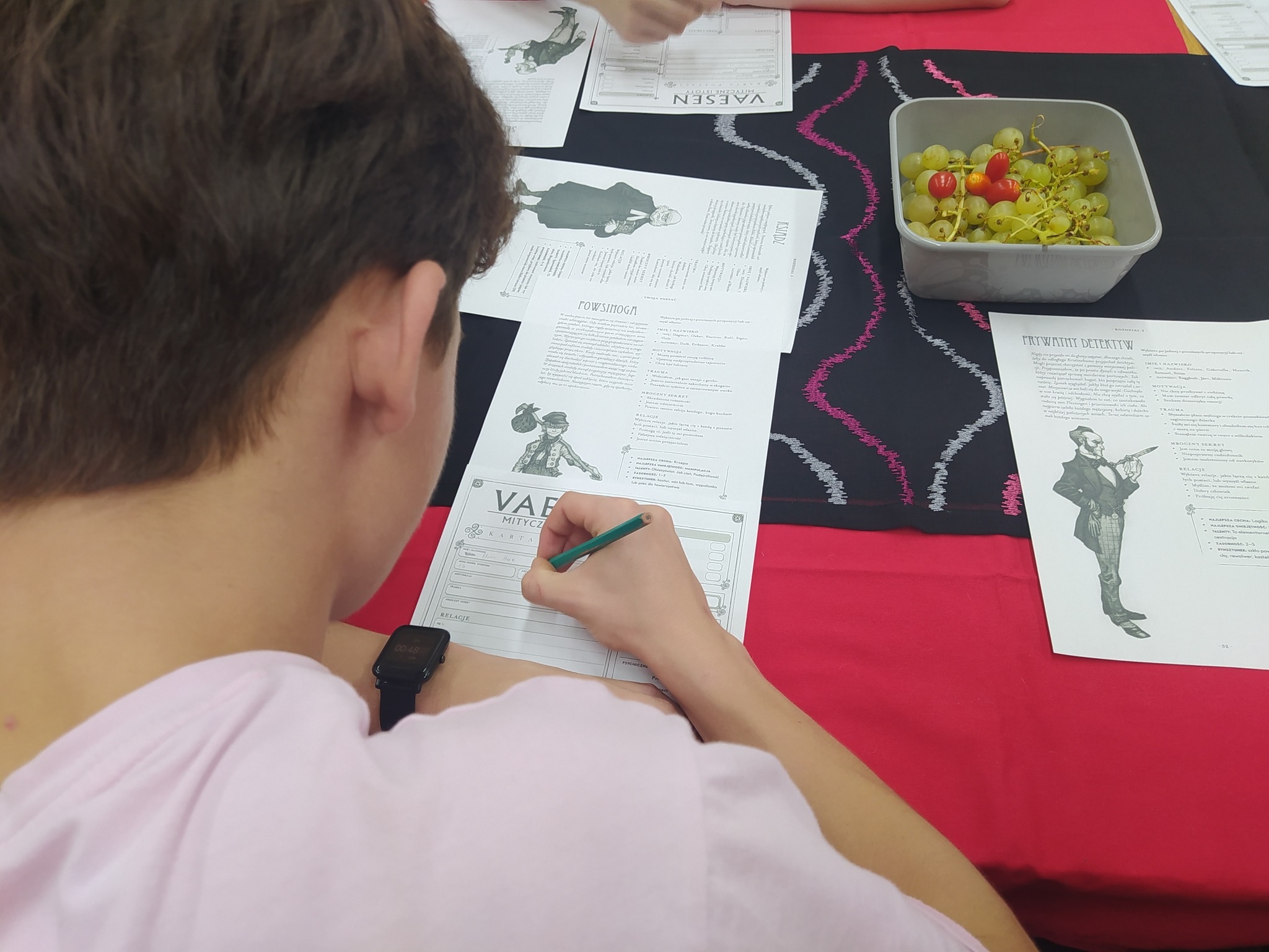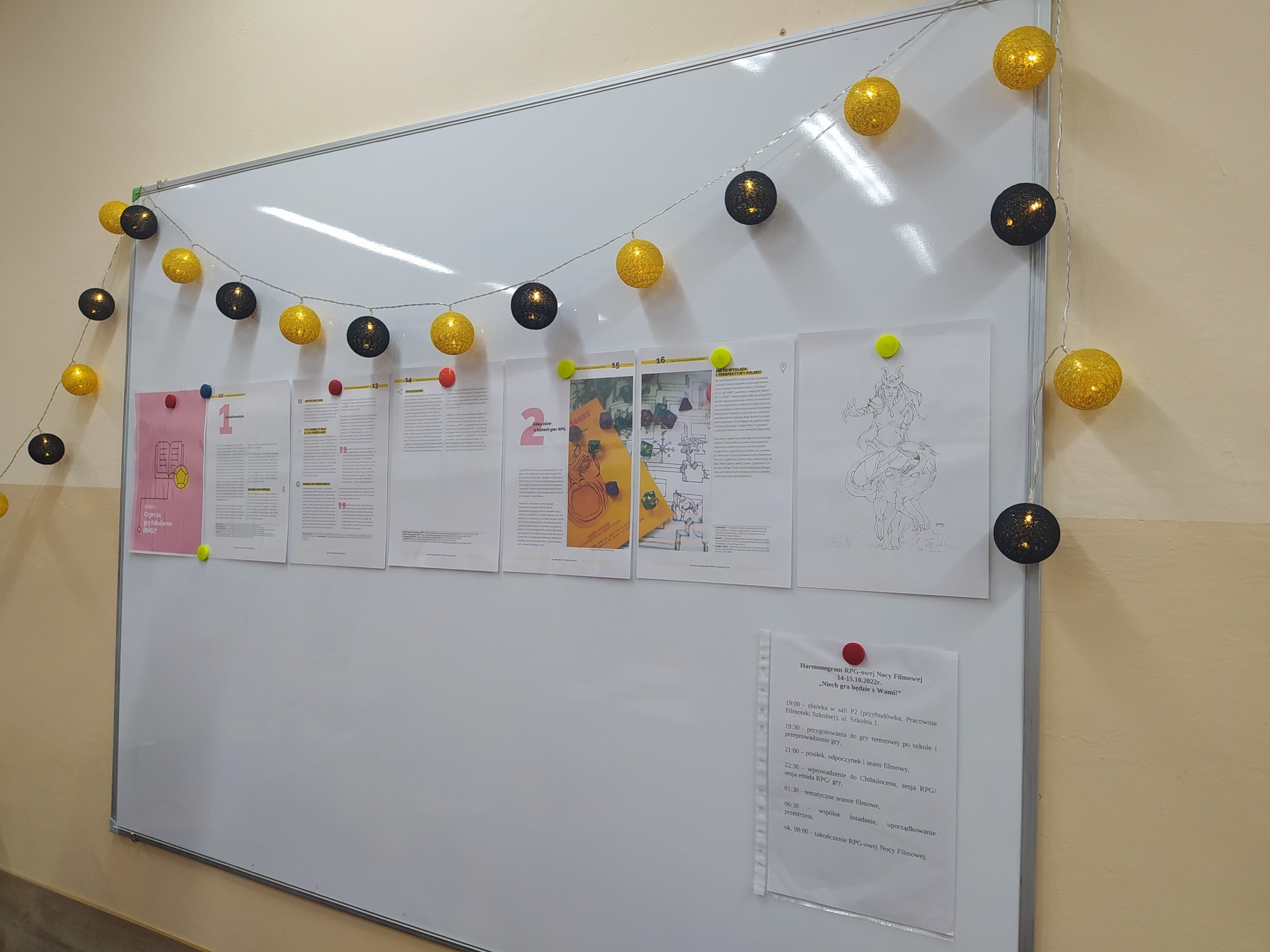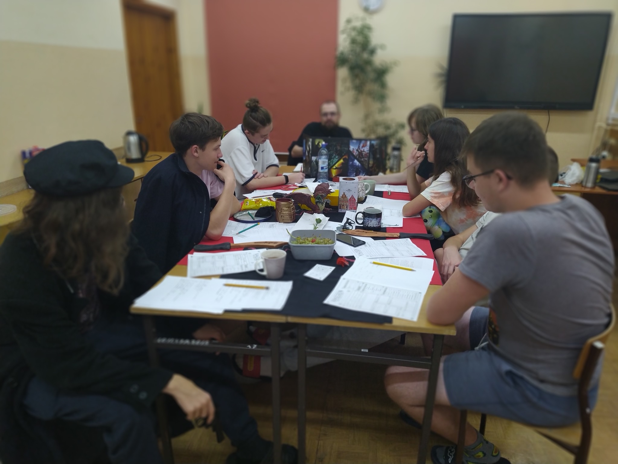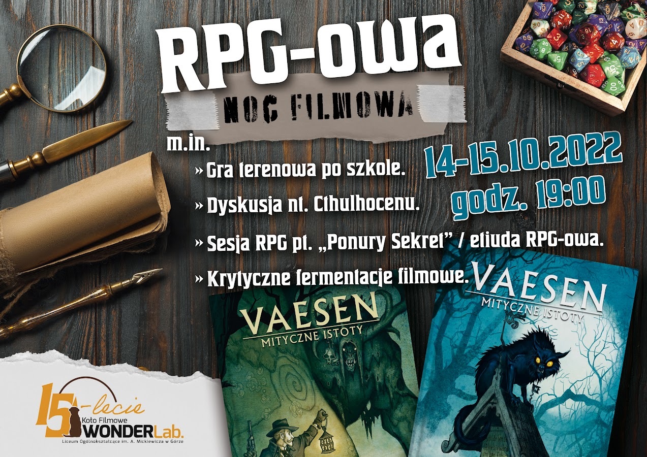 Chcieliśmy, by inauguracja rocznicy objęła właśnie wewnętrznie nasze koło, ponieważ bodźcując się nawzajem energią i pomysłami, możemy wyjść z kolejnymi działaniami także do całej społeczności szkolnej. A my, we własnym zakresie zajęliśmy się erpegową tematyką, rozmawiając o znaczeniu gier fabularnych, współtworząc przy stole opowieść z cyklu „Vaesen” prowadzoną przez Mistrza Gry, tworząc postaci na bazie kart i przyniesionych atrybutów, a także dostrzegając wpływ "rollplejki" na filozoficzne osądy współczesności. Warto wspomnieć, że koncepcje Lovecrafta wyniesione z mitologii Chthulu zostały przywołane przez Donnę Haraway w postaci chthulocenu zakładającego współpracę międzygatunkową, będąc jednocześnie przeciwieństwem dominujących teraz antropocenu i kapitałocenu. To zdumiewające, iż mackowatość wyobrażeniowego bóstwa mogła zostać wykorzystana w ten sposób. Podobnymi ścieżkami kroczyliśmy za X Muzą, zbaczając czasem w tereny trwogi i horroru. Najistotniejsze, że w tym czasie byliśmy w kreatywnym fermencie myślowym, a stworzona historia o grupie Czwartkowej Dziatwy starającej się rozwikłać tajemnicę zaginionego mężczyzny przekroczyła wszelkie granice. Nie wspominając już o terenowej grze po zakamarkach szkolnych oraz integracji. Spotkaniu towarzyszyła możliwość skorzystania z gier planszowych czy gier video i przeglądania podręczników do erpegów. Niech gra będzie z nami!