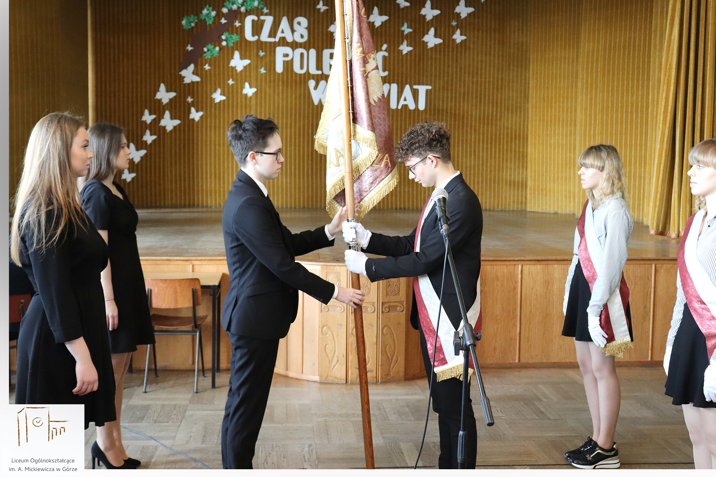 Jak pokolenia przekazują sobie z rąk do rąk lampę żywota, tak uczniowie przekazują młodszym tradycje szkolne. Są one pieczołowicie pielęgnowane przez poszczególne roczniki i stale wzbogacane. Różne są uroczystości szkolne, ale dwie z nich mają szczególną rangę i przebiegają pod auspicjami Adama Mickiewicza. W Liceum Ogólnokształcącym w Górze obok Święta Patrona, drugą ważną i dostojną uroczystością jest ceremonia Przekazania Sztandaru połączona z pożegnaniem młodzieży klas maturalnych. Ceremonię przeprowadził przewodniczący Samorządu Uczniowskiego, uczeń klasy IIIb Tymoteusz Matysiak. Sztandar szkoły, na którym widnieją słowa Wieszcza „Ojczyzna-Nauka-Cnota”, z rąk dotychczasowego chorążego, Mateusza Janika otrzymał na kolejny rok szkolny Dawid Perzyński.