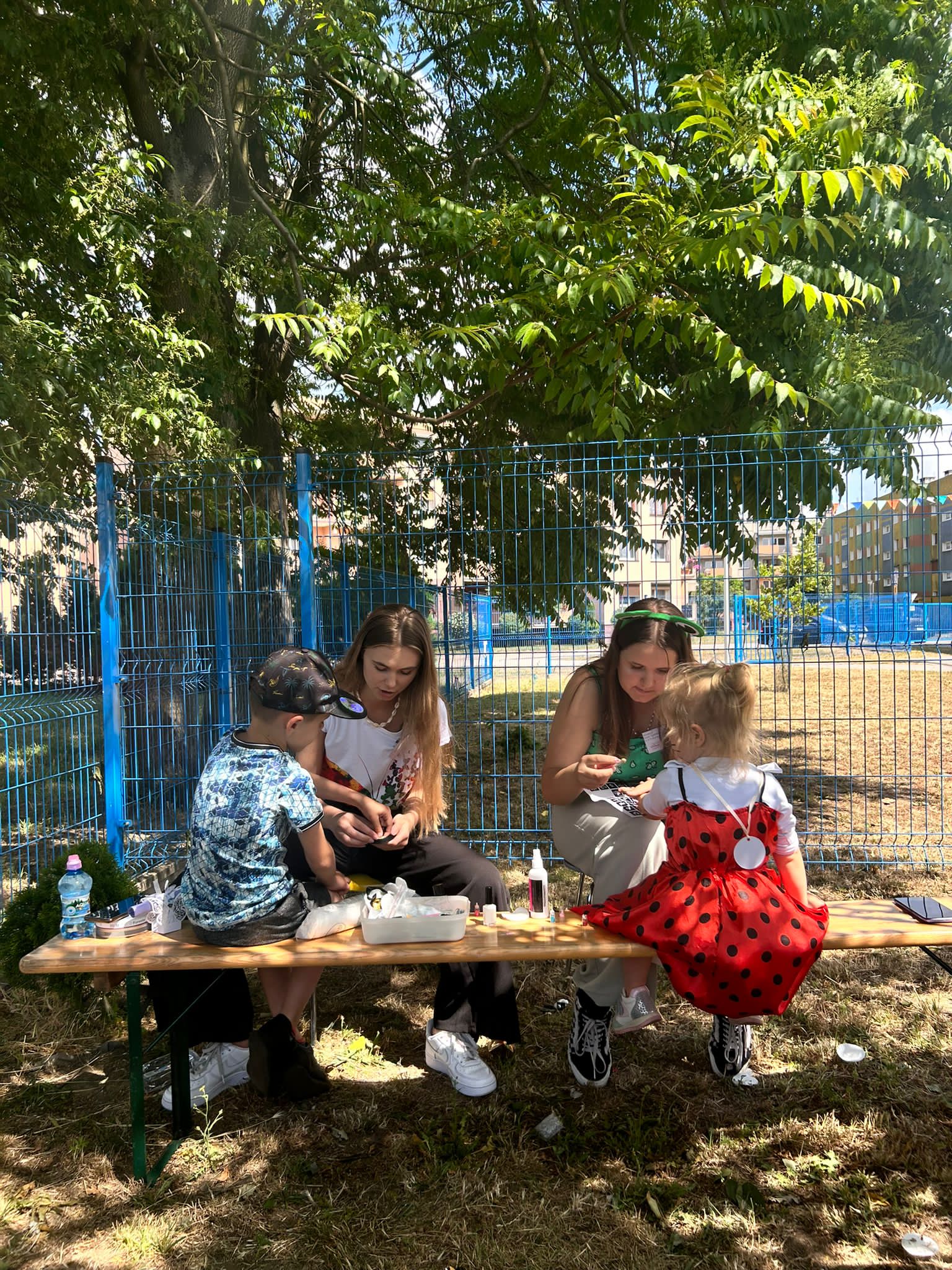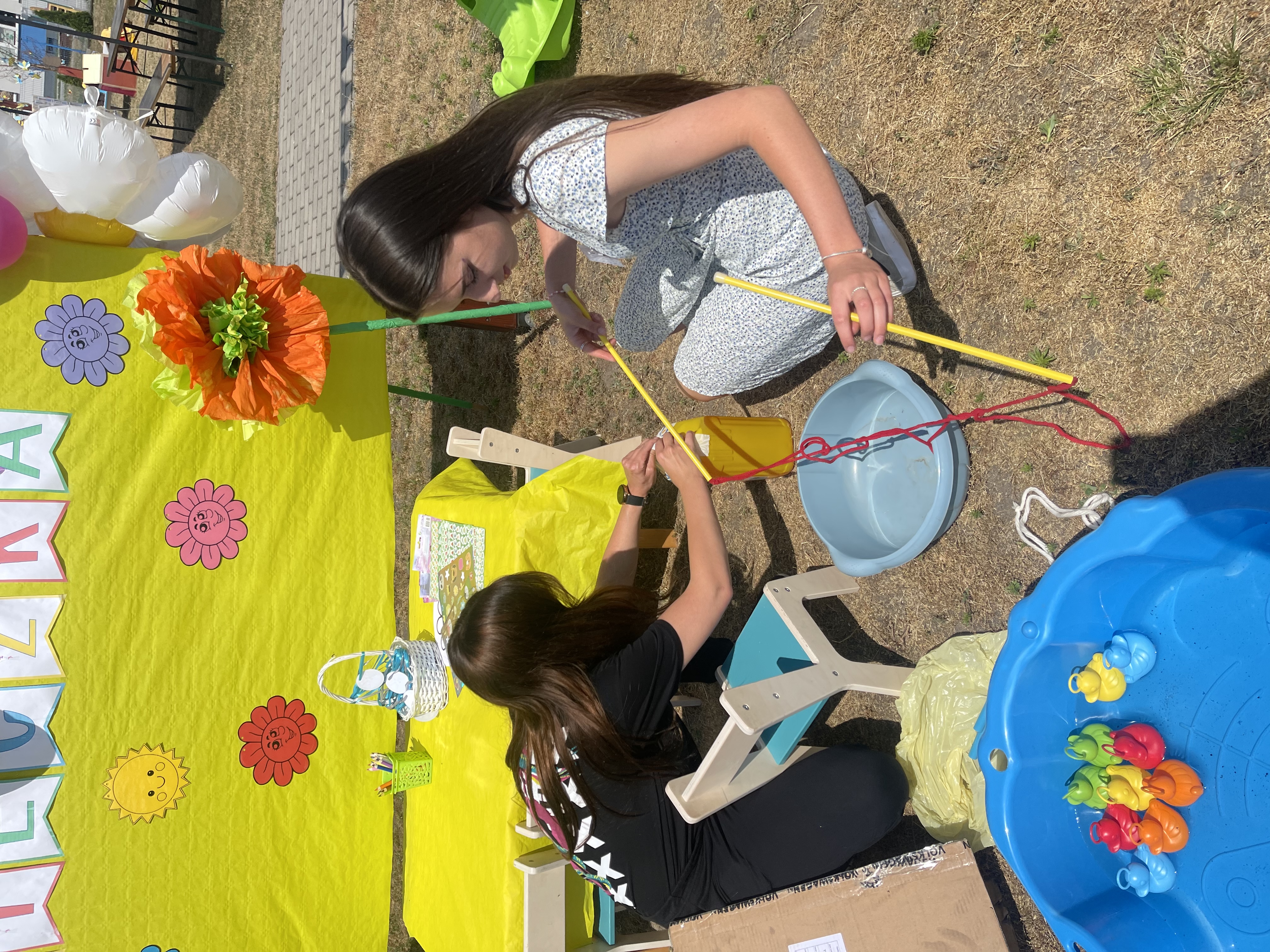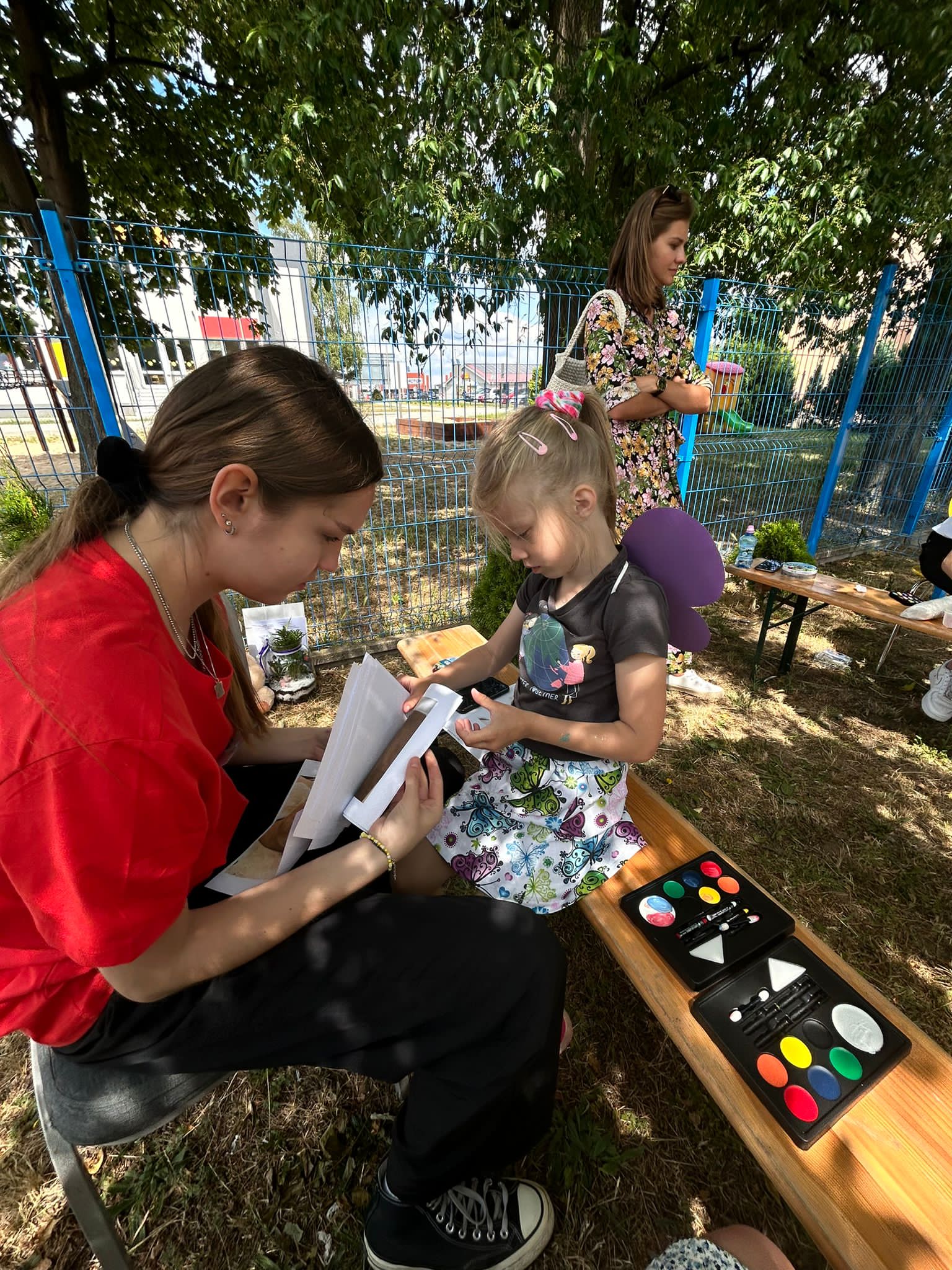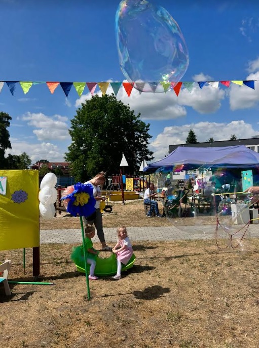 Pani Dyrektor przybyła na uroczystość w asyście uczniów swojej szkoły: Zuzanny Latki, Weroniki Jakubik, Julii Stankiewicz, Huberta Utrajczyk, Tomasza Koziołkowskiego, Mateusza Matysiaka, Wiktorii Cieplik, którzy na kilka godzin wcielili się w rolę animatorów. Licealiści pod opieka Pani Ireny Dziamarskiej oraz Pani Joanny Krzyszkiewicz świetnie przygotowali się do swojej roli, dbając o każdy szczegół, by stworzyć dzieciom miłą i przyjazną atmosferę. Specjalnie na tę okazję przygotowali wiele atrakcji dla maluchów, wykazując się ogromną kreatywnością. Dużym zainteresowaniem wśród milusińskich cieszyły się zwierzątka wykonywane przez młodzież z kolorowych baloników. Uwagę maluszków przyciągnął również widok ogromnych fruwających w powietrzu mydlanych baniek . Dzieci chętnie poddawały się " zabiegowi" malowania twarzy, wybierając najczęściej motywy ulubionych postaci z bajek. Maluszki z uśmiechem i radością korzystały z zabaw na dmuchanych zamkach, pod opieką młodzieży LO. Szczęścia nie było końca. Dzieciaczki wcale, a wcale nie miały zamiaru rozstawać się ze swoimi nowymi przyjaciółmi. Nawet, kiedy nadeszła pora drzemki dla maluchów, starsi koledzy towarzyszyli im przy zasypianiu nucąc przyjemne kołysanki do snu. Licealiści pomagali również przy przebieraniu i karmieniu dzieci...