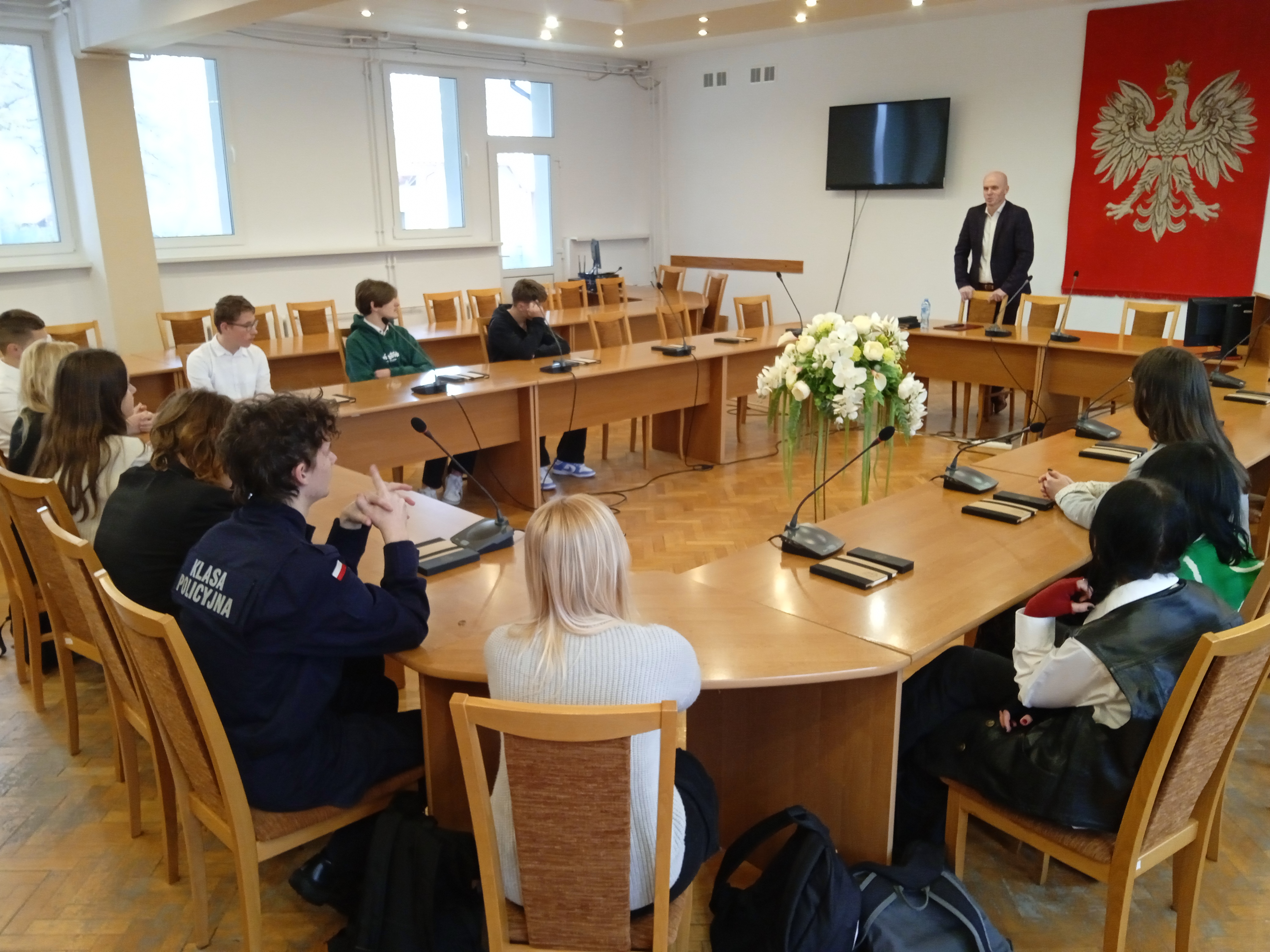 O działalności samorządu powiatowego we wszystkich jego istotnych aspektach opowiedział młodzieży licealnej sekretarz Powiatu Górowskiego pan Piotr Wołowicz,