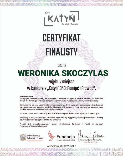 Weronika napisała esej, w którym zaprezentowała sylwetkę patronki Fundacji, Janiny Lewandowskiej. Była to niezwykła osoba, córka gen. Dowbór-Muśnickiego, porucznik lotnictwa, jedyna kobieta w Europie, która wykonała skok ze spadochronem, ale i też jedyna kobieta żołnierz zamordowana w Katyniu.