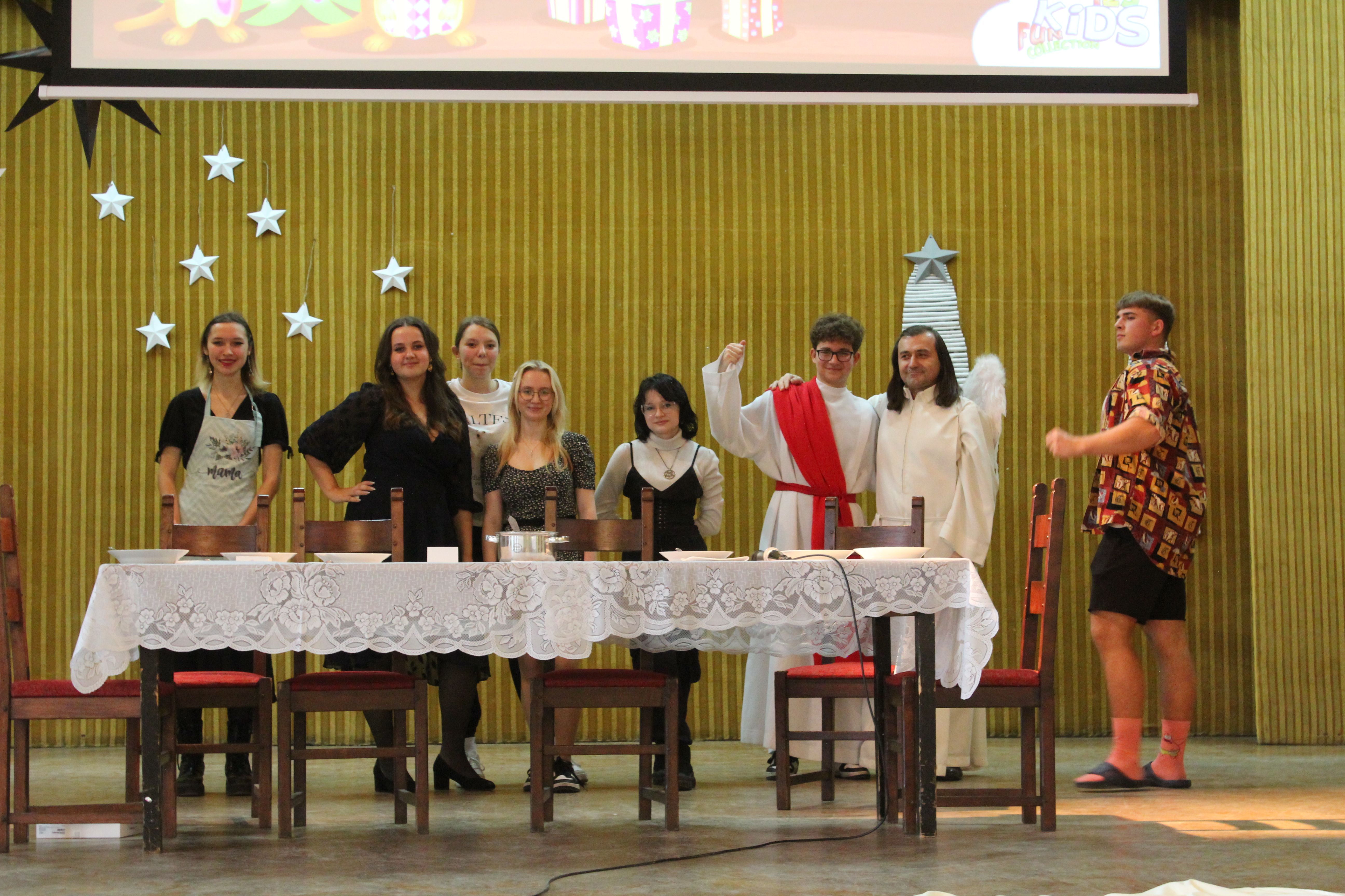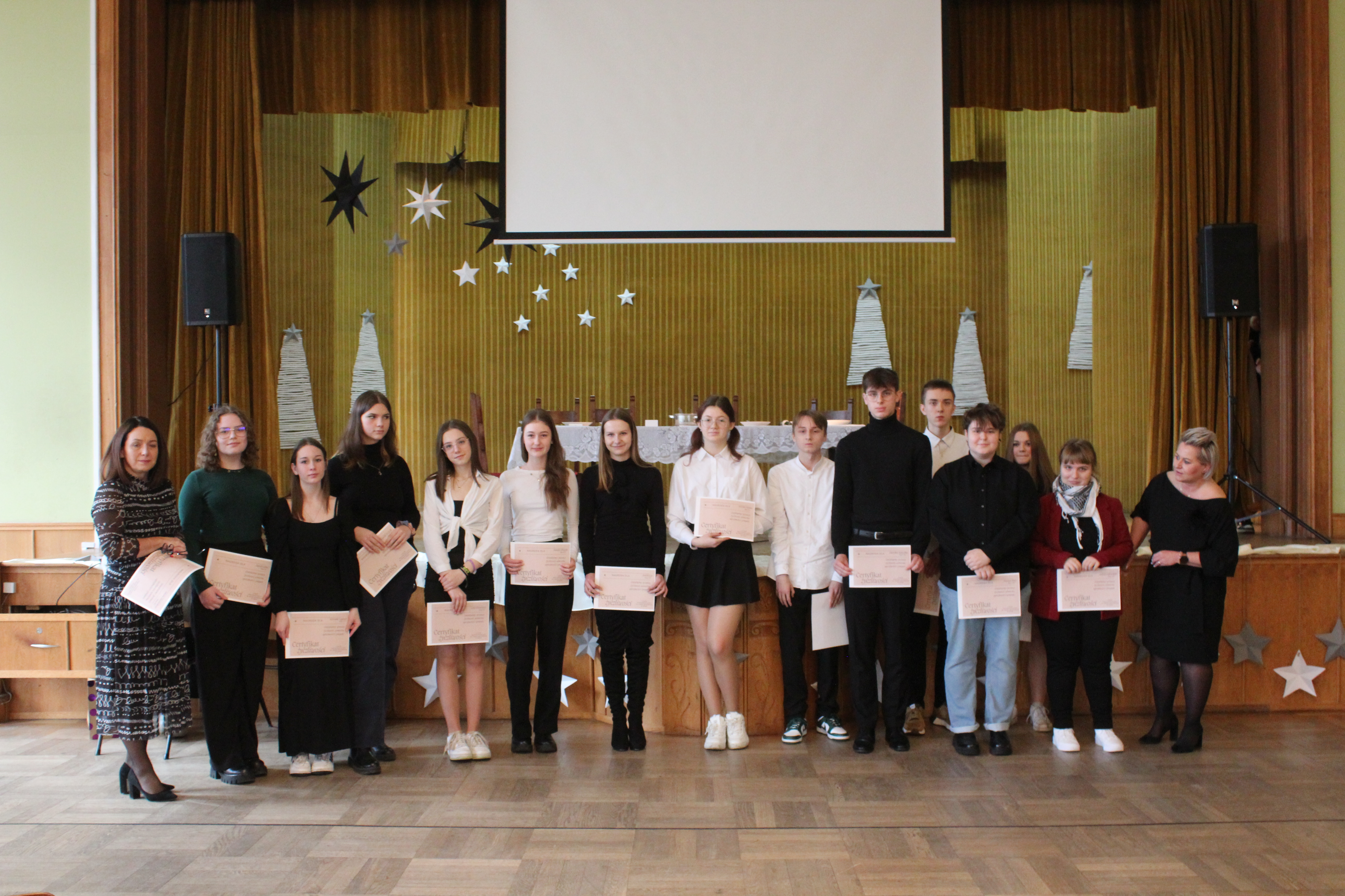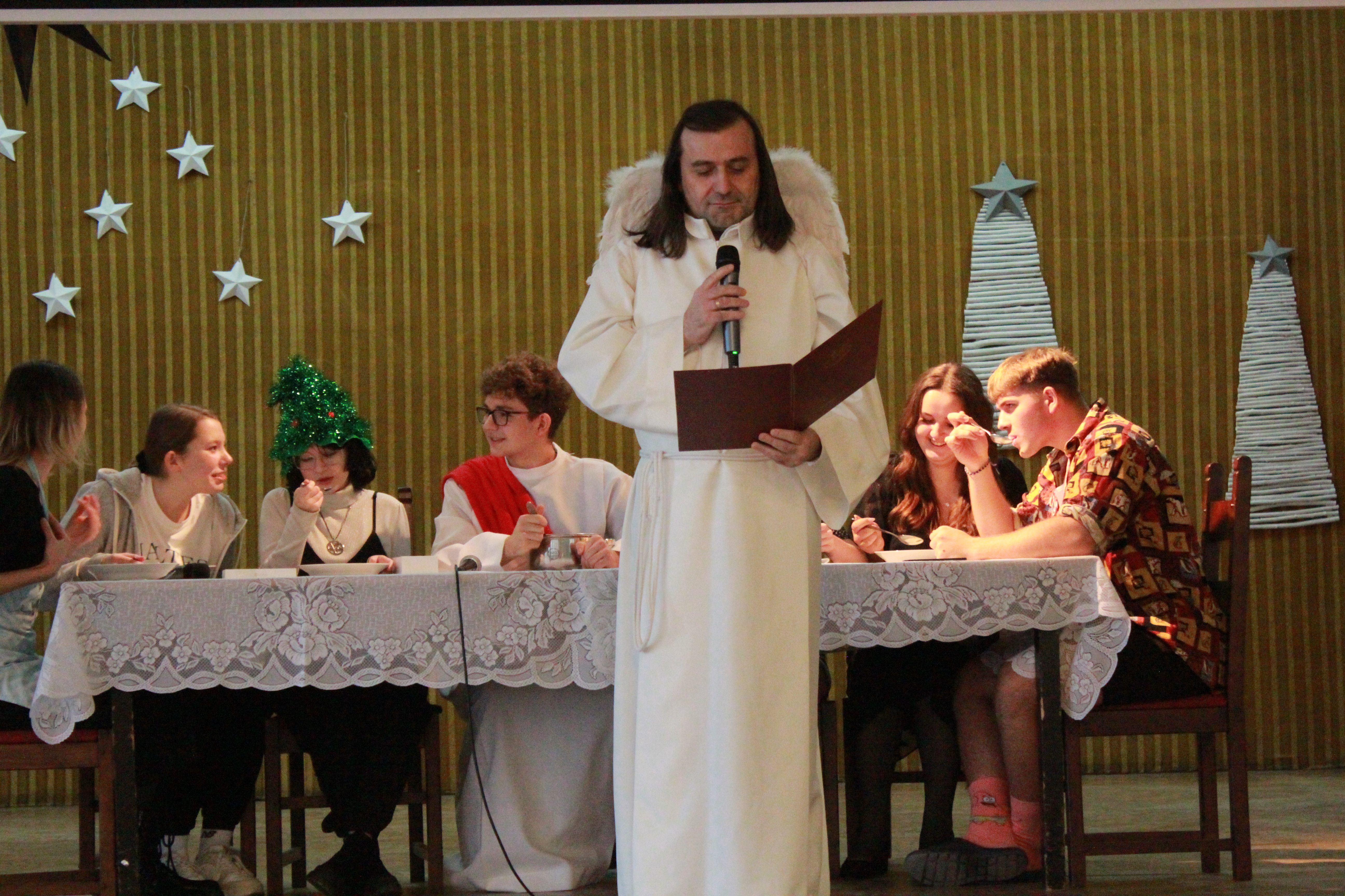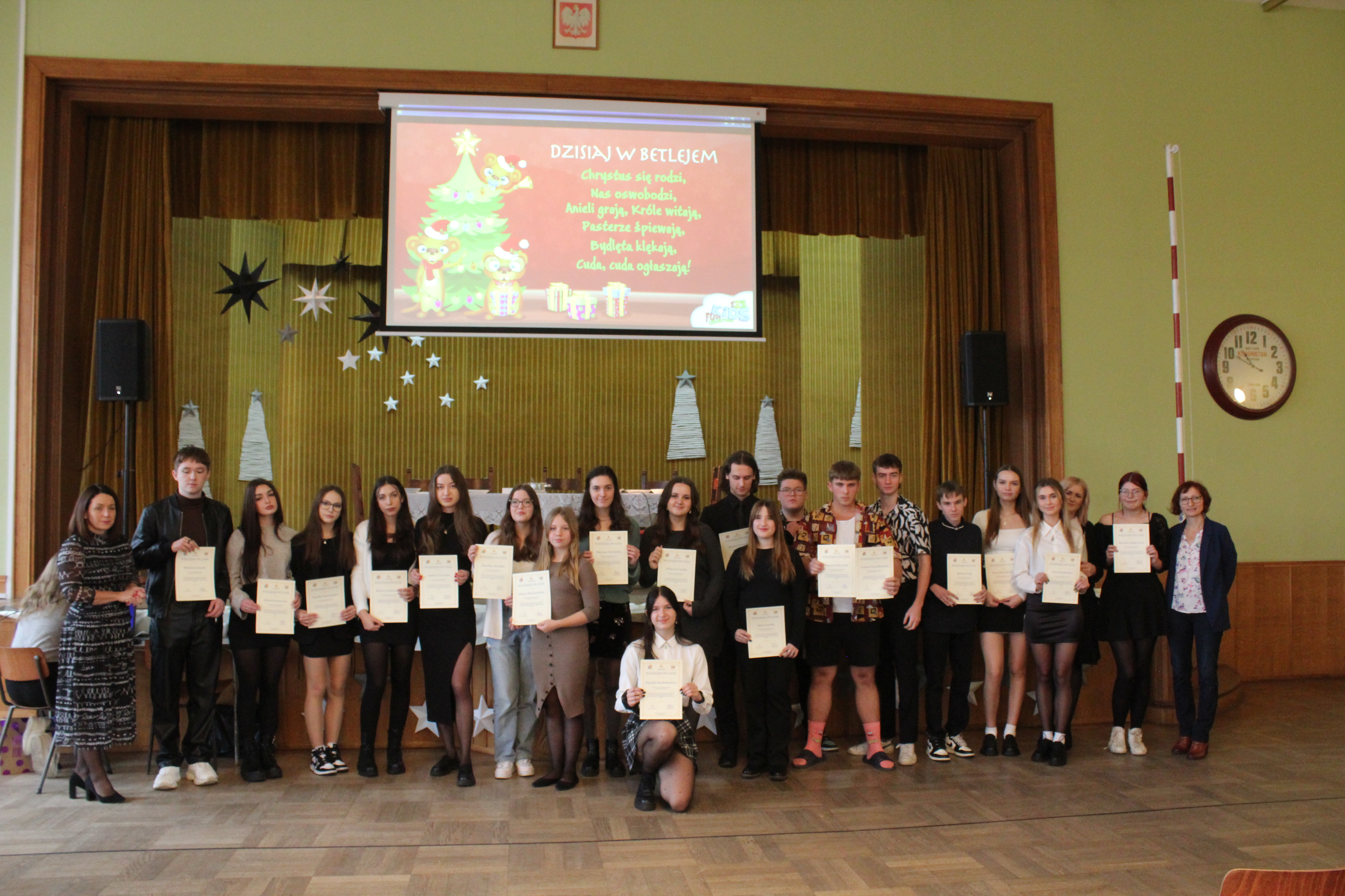 Rano część młodzieży udała się do kina aby obejrzeć film „Raport Pileckiego”. Po zakończeniu projekcji cała społeczność szkolna udała się do auli na przedświąteczne spotkanie, Główną jego część wypełnił spektakl w reż. ks Łukasza. Widowisko skłoniło nas wszystkich do radosnego spędzenia Świąt Bożego Narodzenia w rodzinnym gronie przy wigilijnym stole i śpiewaniu kolęd.