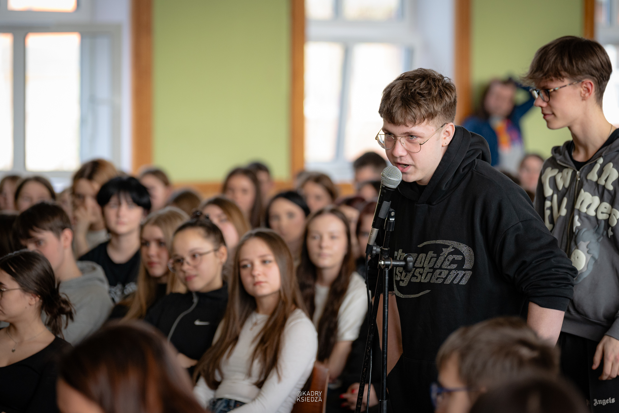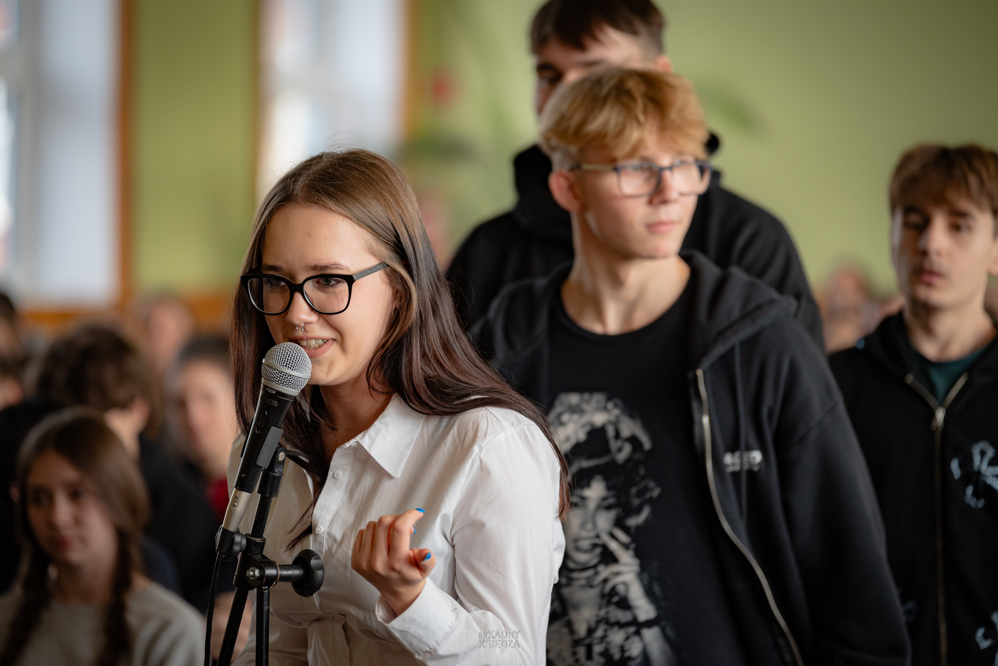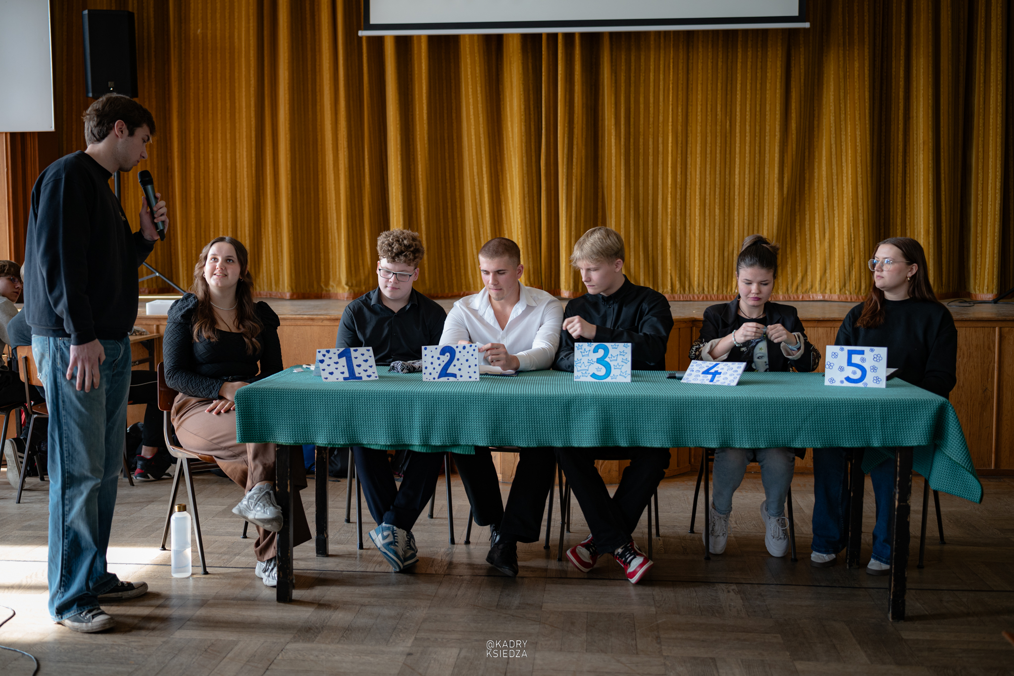 Po prezentacji przyszedł czas na główny cel spotkania, czyli debata kandydatów na przewodniczącego Samorządu Uczniowskiego. W tegorocznych wyborach wystartowała imponująca liczba sześciu kandydatów, w tym jedna koalicja składająca się z Huberta Utraja i Tomasza Koziołkowskiego co z pewnością wpływa na dodatkowy wymiar zaciętej rywalizacji. Następni kandydaci to: Wiktoria Cieplik, Nikola Mazur, Alan Stojanowski oraz Maja Zmuda. Każdy z kandydatów miał niełatwe zadanie przedstawić nie tylko swoją osobę, ale i wizję przyszłych działań na rzecz społeczności szkolnej oraz przekonać do siebie słowem i właściwą postawą.