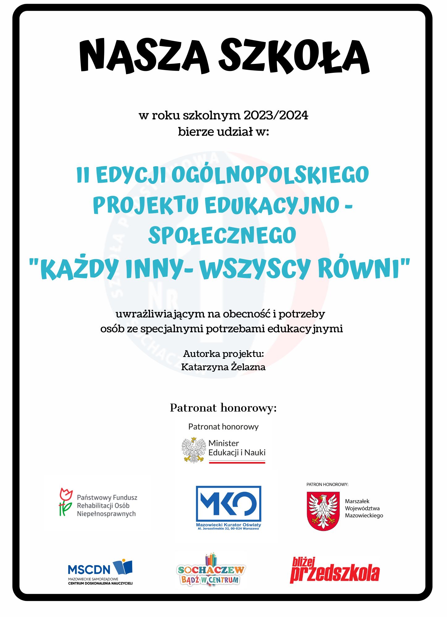 Nasza szkoła dołaczyła do II edycji Ogólnopolskiego projektu edukacyjno – społecznego „Każdy inny – wszyscy równi”. Mamy nadzieję, że udział w projekcie będzie niezapomnianą przygodą dla wszystkich uczestników. W linku przesyłamt plakaty informujące o udziale w projekcie.