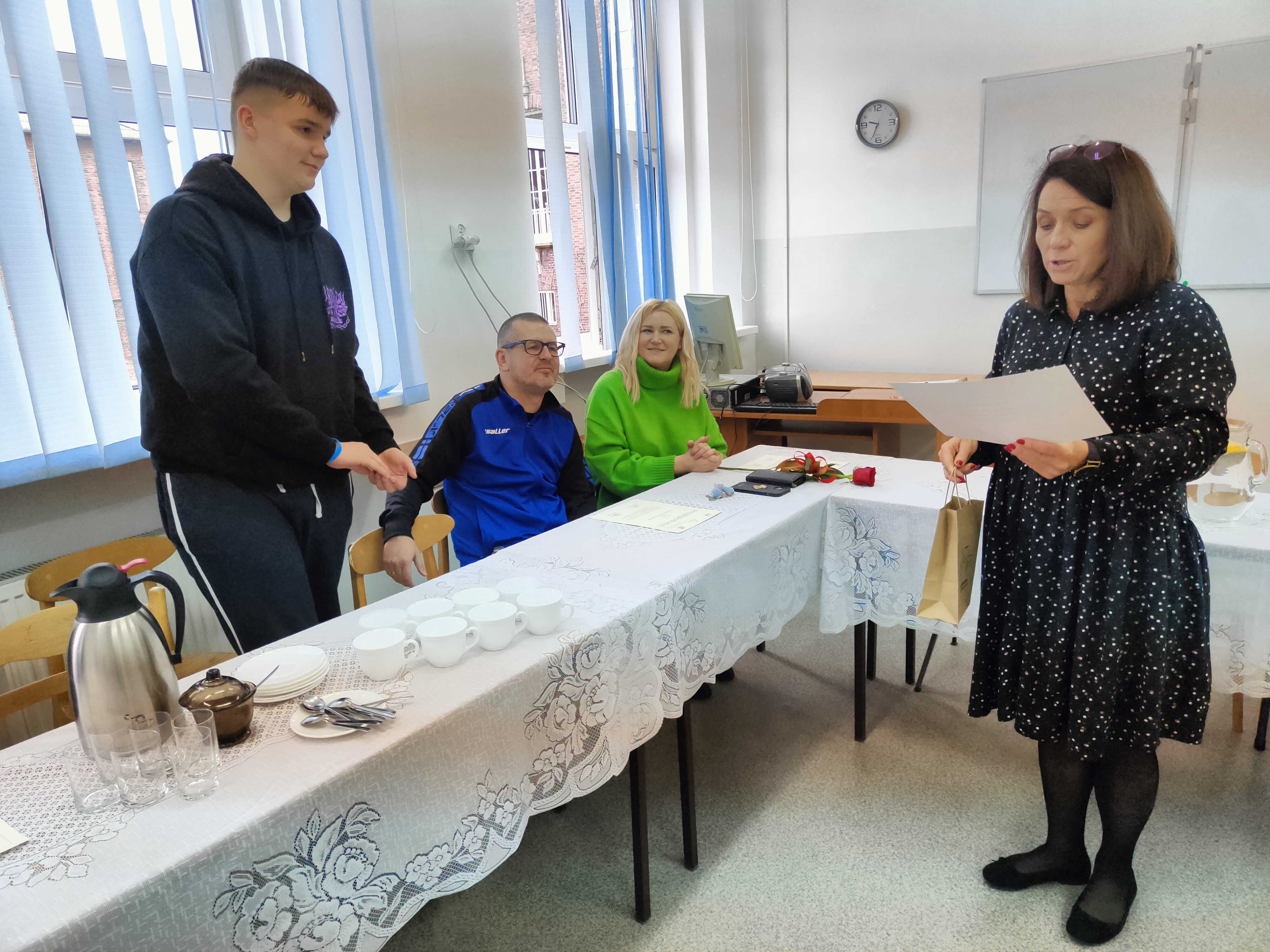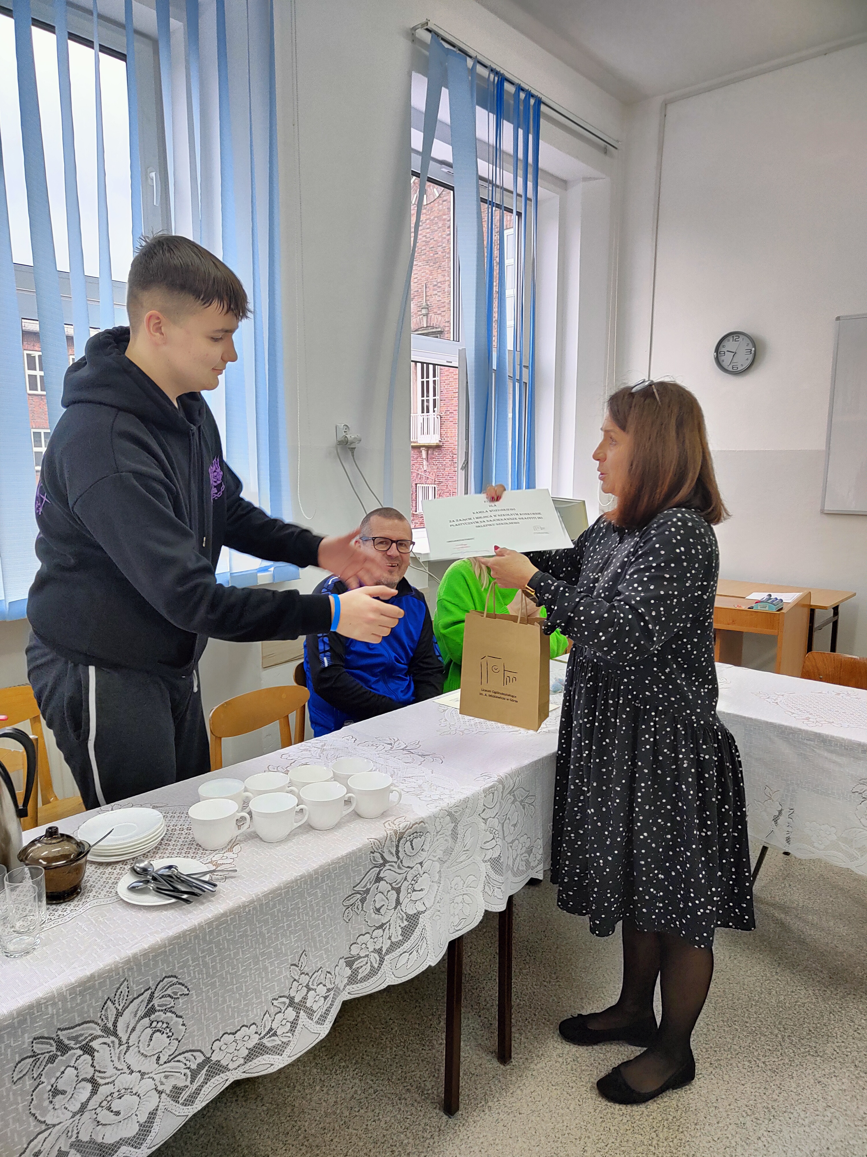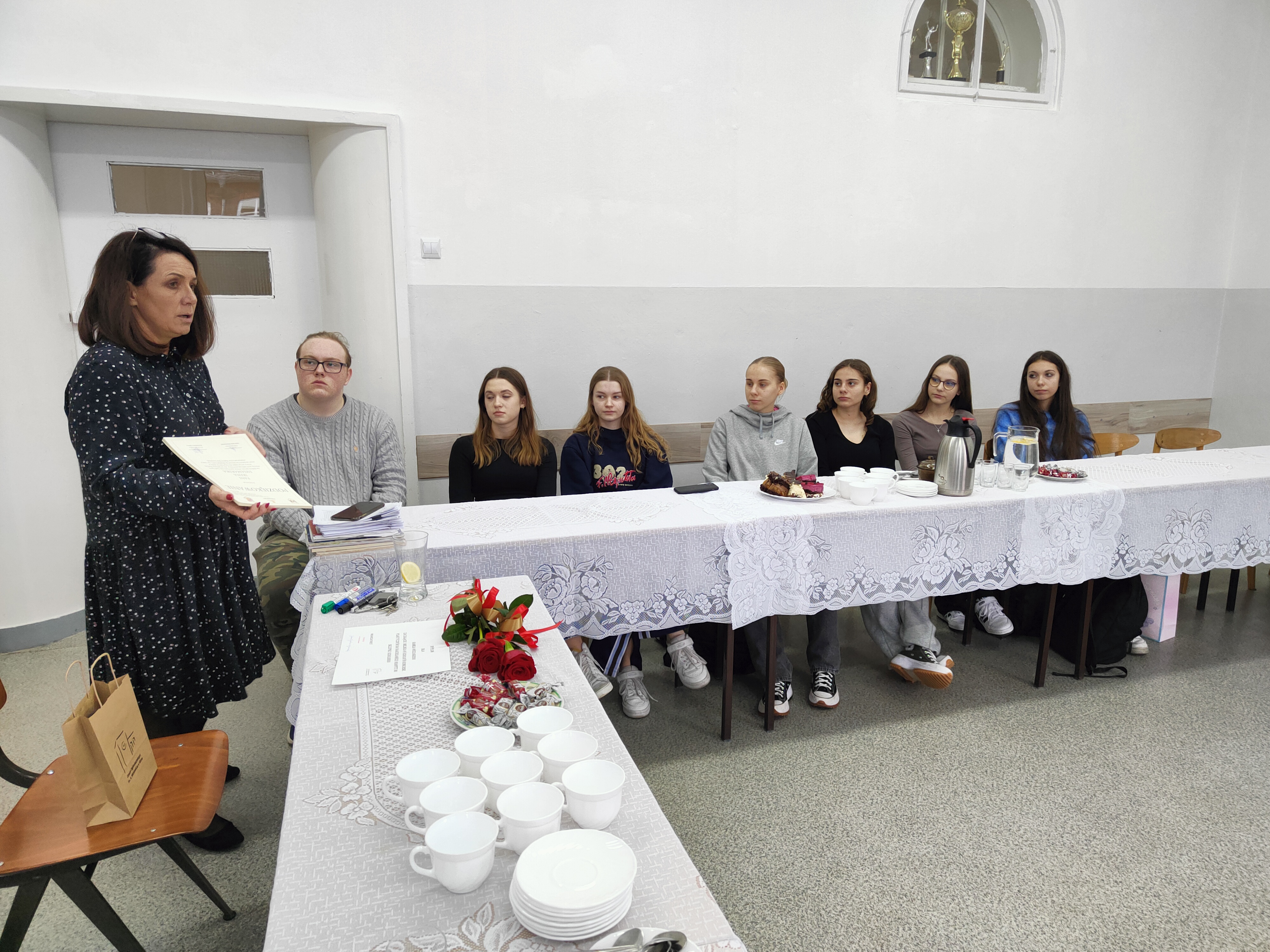 W miłej atmosferze, przy cieście i słodkościach pani dyrektor Magdalena Mielczarek podziękowała wszystkim, którzy w roku 2022 wspierali działania charytatywne w naszej szkole: pani Irenie Dziamarskiej, pani Joannie Krzyszkiewicz-Stojanowskiej oraz panu Wojciechowi Janickiemu.