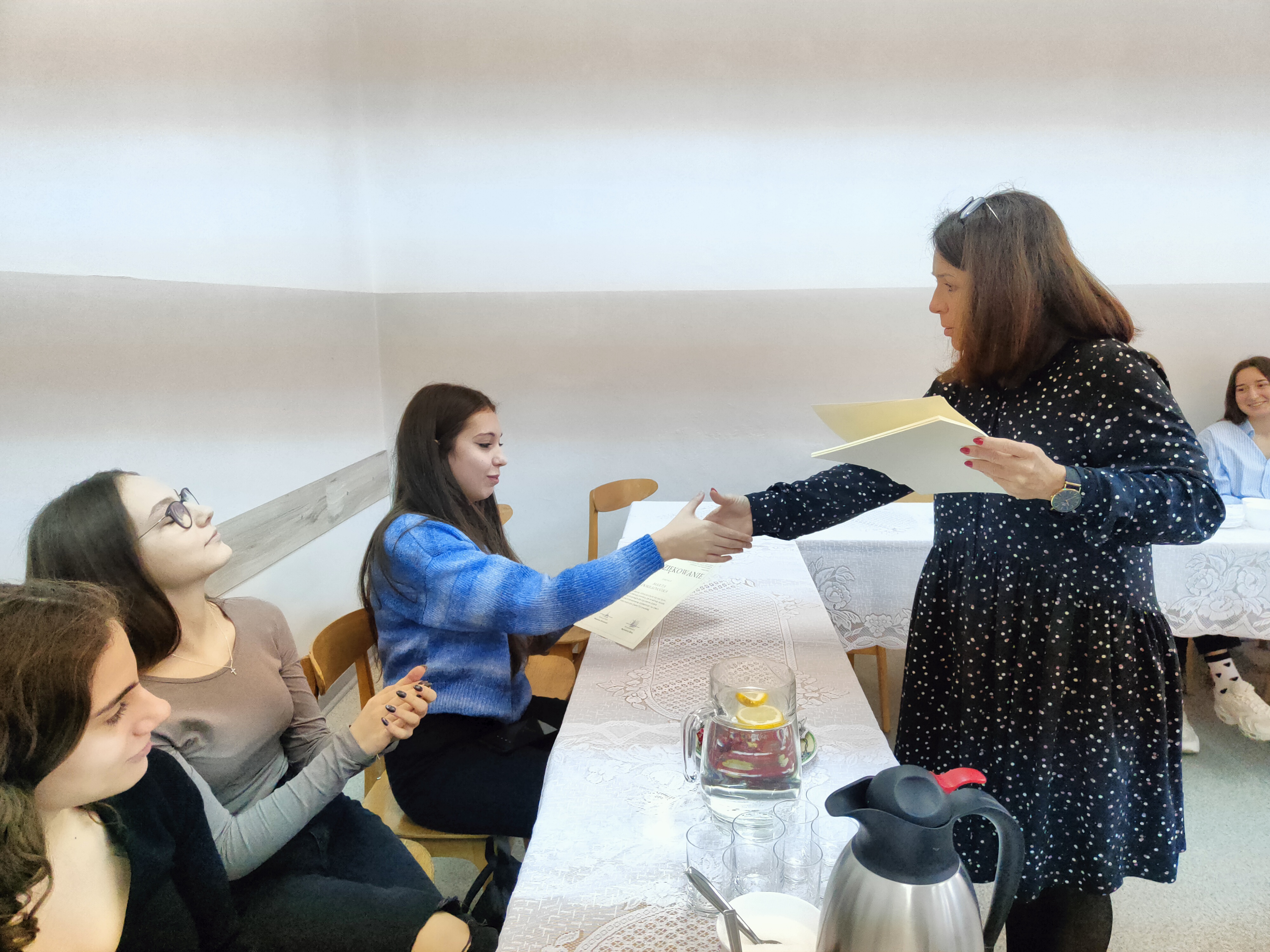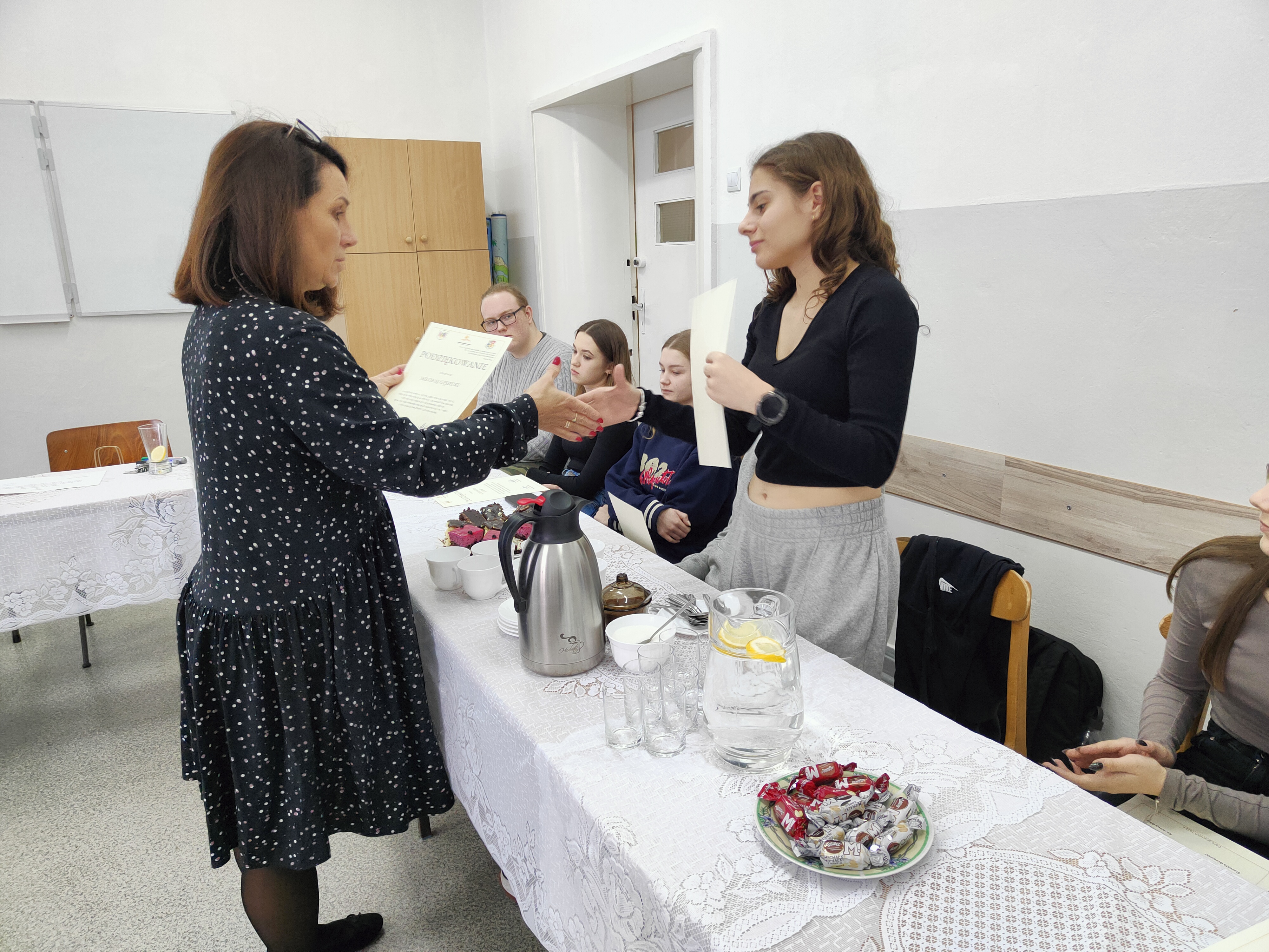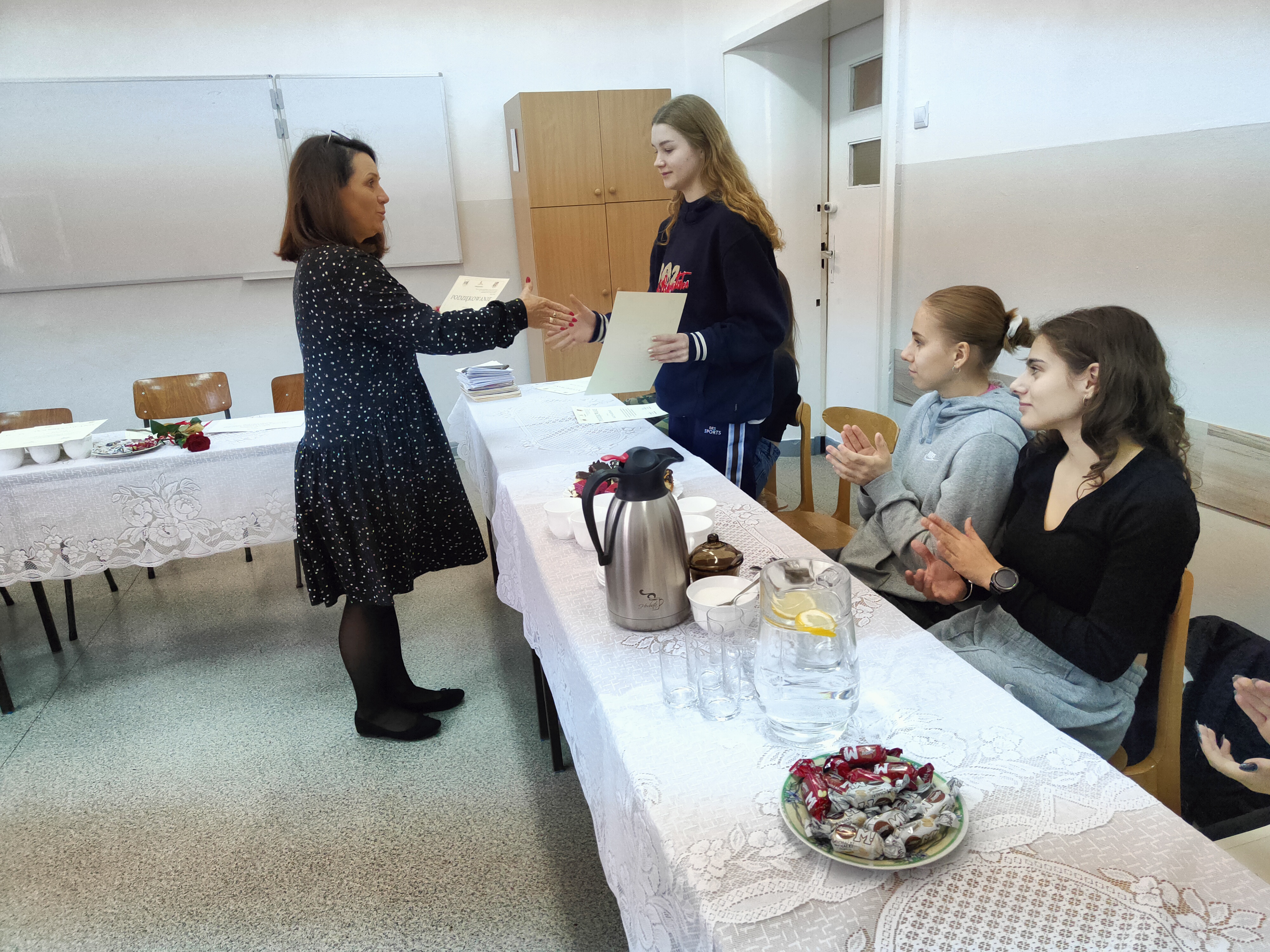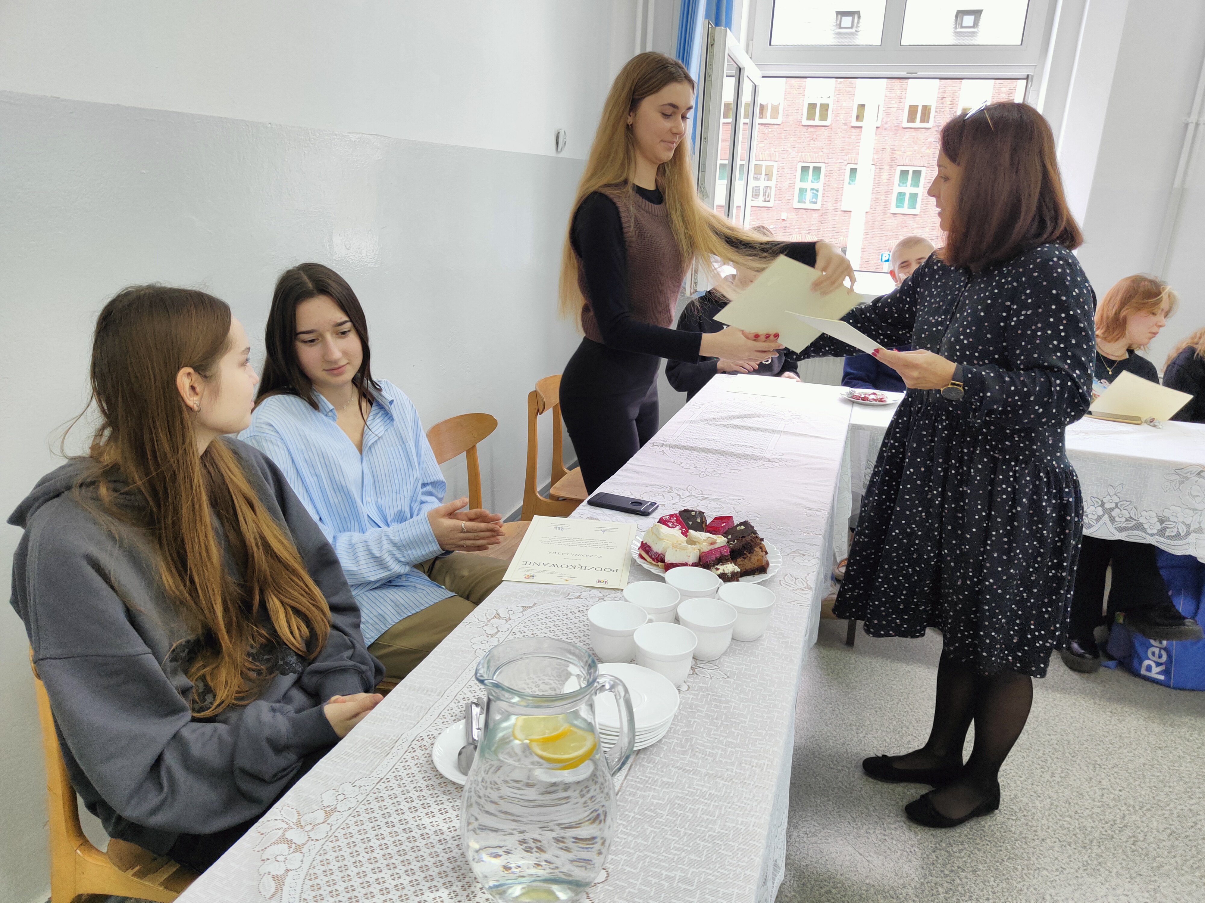 W miłej atmosferze, przy cieście i słodkościach pani dyrektor Magdalena Mielczarek podziękowała wszystkim, którzy w roku 2022 wspierali działania charytatywne w naszej szkole: pani Irenie Dziamarskiej, pani Joannie Krzyszkiewicz-Stojanowskiej oraz panu Wojciechowi Janickiemu.