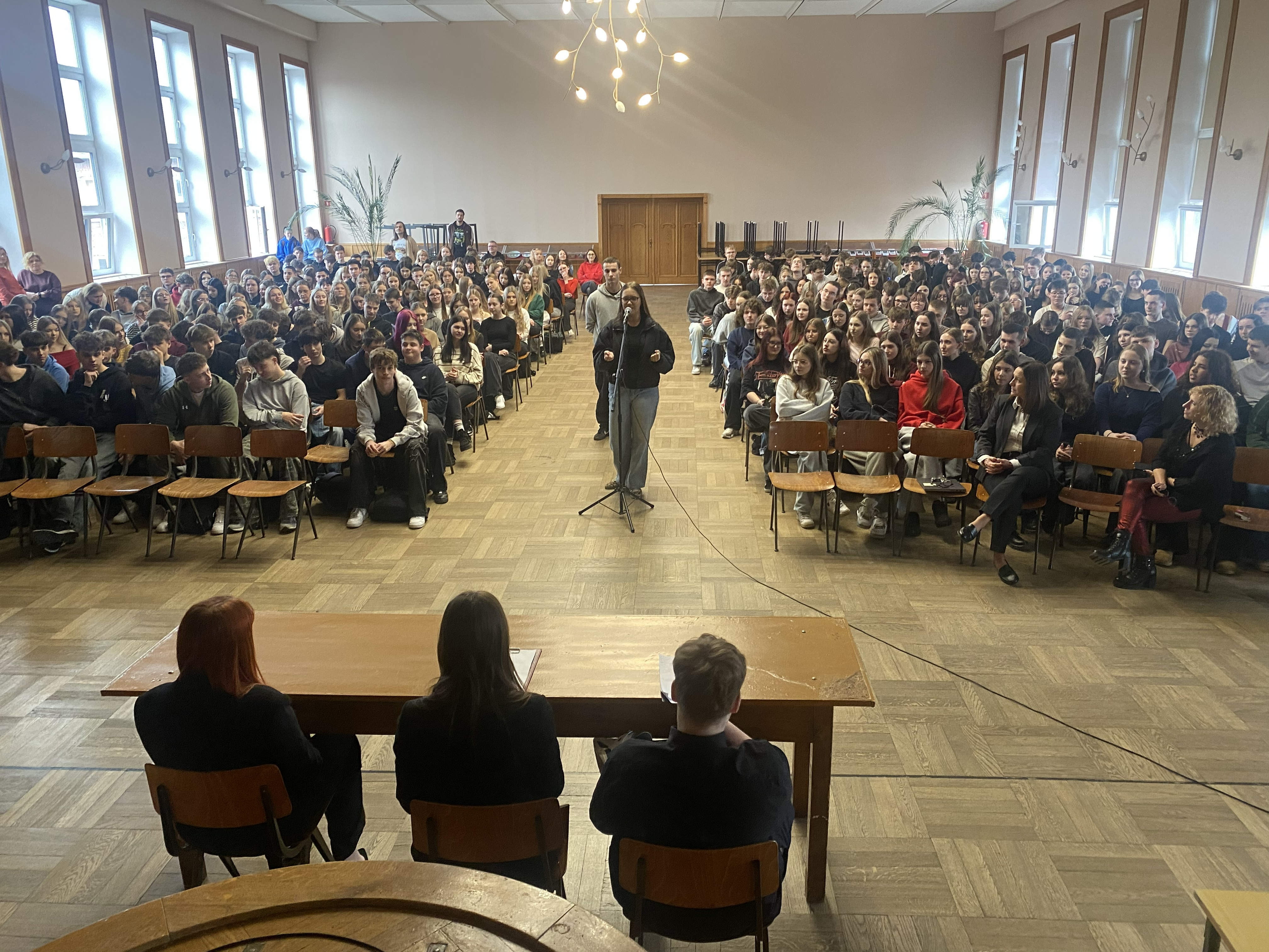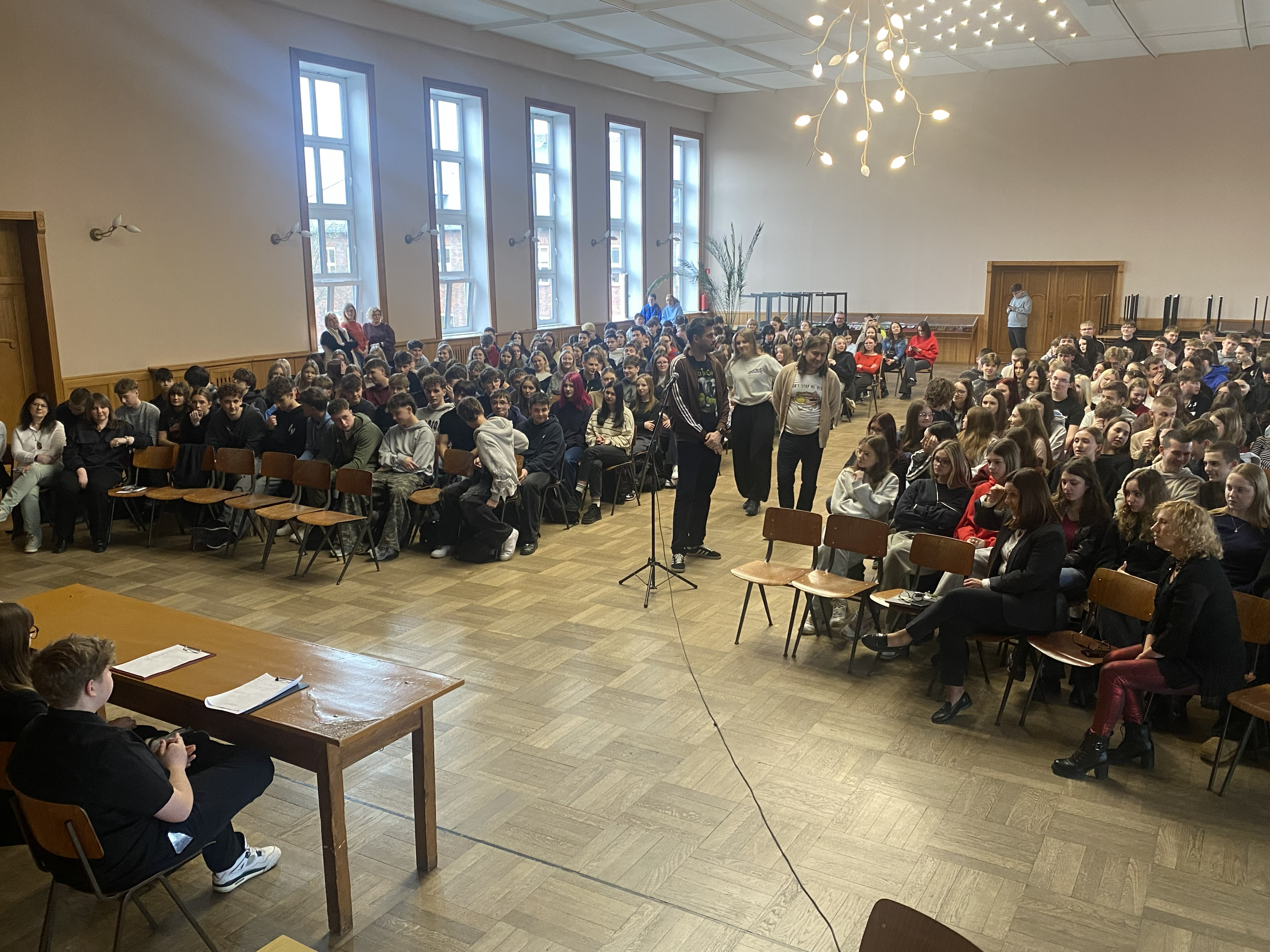 Spotkanie, w którym uczestniczyła cała społeczność szkolna rozpoczęło się od wystąpienia Huberta Utrajczyka. Następnie oddał głos kandydatom na przewodniczącego SU czyli Maciejowi Jankowskiemu, Gabrieli Ślosarczyk oraz Mai Wojciechowskiej. Każdy z nich miał niełatwe zadanie zaprezentować nie tylko swoja osobę, ale przede wszystkim wizję przyszłych działań na rzec społeczności szkolnej oraz przekonać do swojej kandydatury słowem i właściwą postawą. Obecny przewodniczący z typową sobie energią przeprowadził młodszych kolegów przez meandry autoprezentacji oraz pytań z sali dotyczących chociażby wskazania swoich mocnych stron i zasobów czy doprecyzowania planów wyborczych.