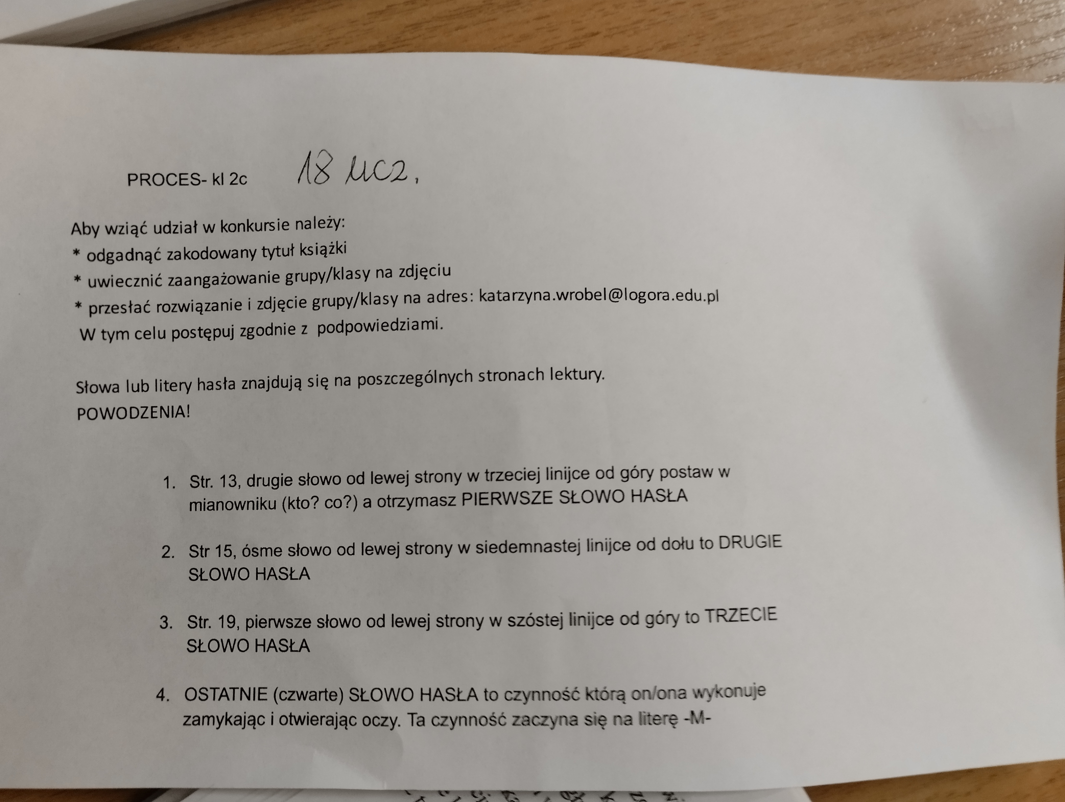 W międzyklasowych zmaganiach zwyciężyli uczniowie i uczennice z klasy 2b, to oni najszybciej odkodowali hasło. Na drugim miejscu uplasowała się klasa 3e, a trzecie miejsce wywalczyła 3C. Konkurs przebiegał w przyjemnej atmosferze. Niemal wszystkim drużynom udało się odkodować zaszyfrowane w książkach hasło co świadczy o bardzo dobrych umiejętnościach pracy zespołowej. Wszystkim uczestnikom bardzo dziękujemy za solidną pracę a zwycięzcom jeszcze raz gratulujemy.