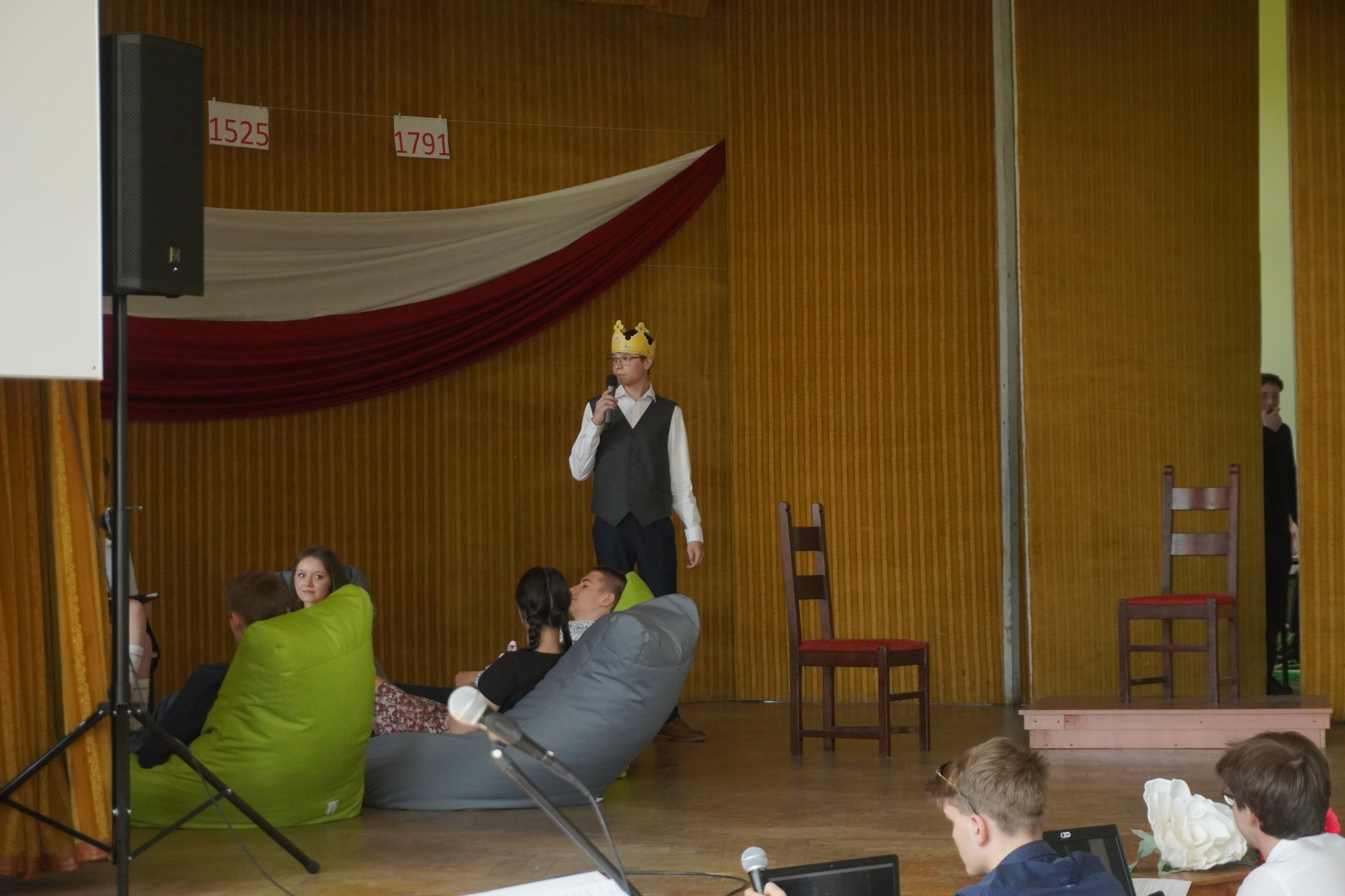 Uroczystość rozpoczęliśmy Hymnem Narodowym, w obecności Pocztu Sztandarowego i Pocztu Flagowego. W części artystycznej – przygotowanej przez p. Tomasza Woźniczkę - uczniowie klasy 2A przedstawili opowieść o dziejach Polski od roku 1000-go do czasów Sejmu Wielkiego, przeplataną scenkami historycznymi. Apel uświetniła swoim pięknym głosem Małgorzata Gołębiowska śpiewając utwór „Smutno mi Boże”. Podczas apelu uczciliśmy również jubileusz 1000- lecia Królestwa Polskiego, prezentując wyniki pracy na konkurs historyczny - komiks o koronacji Bolesława Chrobrego. Zespół z klasy 2A zdobył 3 miejsce w tym konkursie. W trakcie uroczystości Pani Dyrektor Magdalena Mielczarek wręczyła gratulacje i podziękowania p. Dorocie Giezek, za przygotowanie i przeprowadzenie lekcji otwartej o CERN. Ogłoszone zostały również wyniki konkursu na pracę artystyczną „Śladami CERN”. W konkursie tym I miejsce zdobyła Zuzanna Uba z klasy 3b. Na zakończenie uroczystości odbył się internetowy quiz o wydarzeniach historycznych związanych z tematyka apelu, który wygrała klasa 1A. Obchody Święta 3 Maja w naszej szkole pokazały, że młode pokolenie potrafi z dumą i zaangażowaniem uczestniczyć w budowaniu świadomości historycznej i patriotycznej.