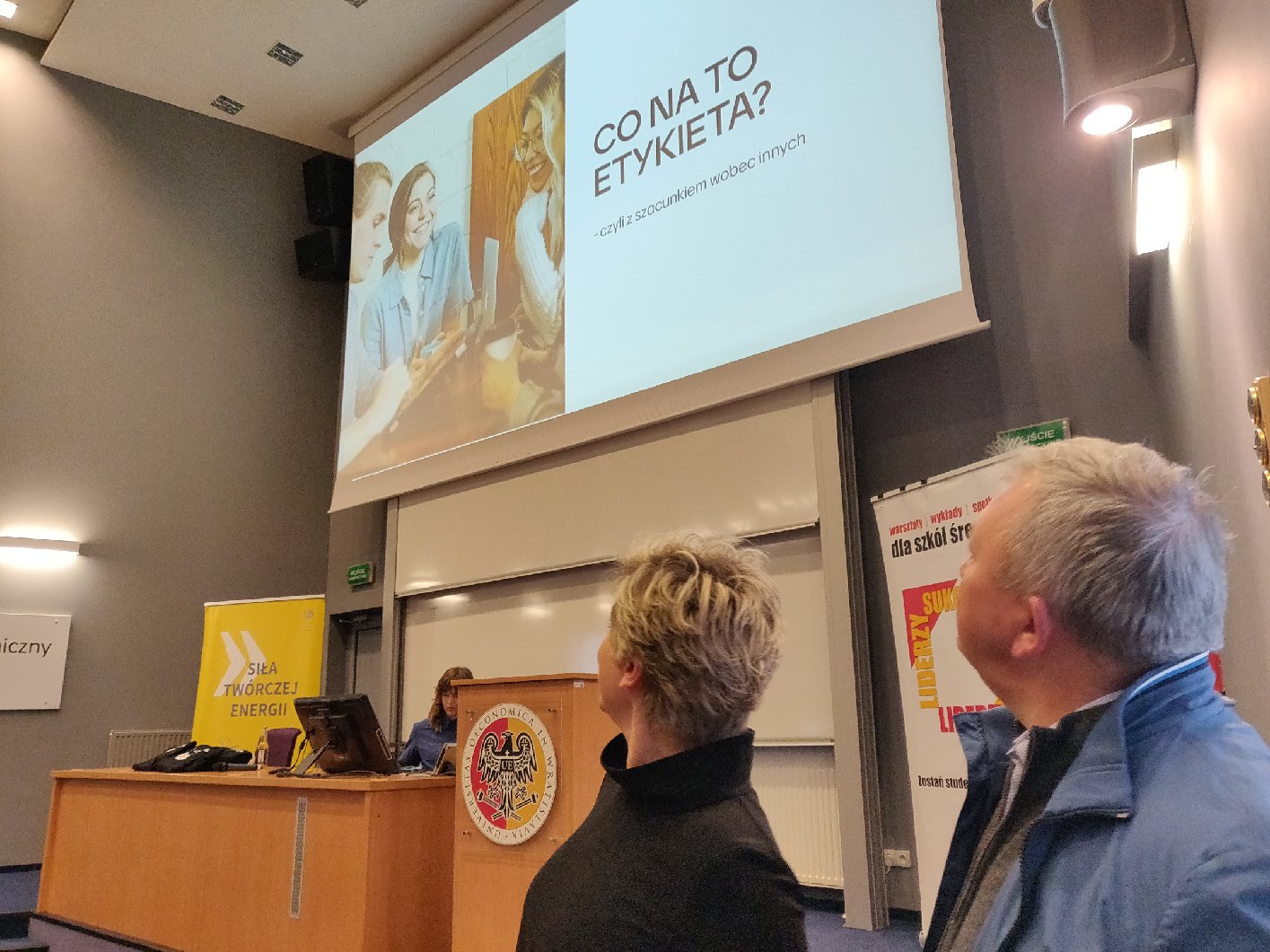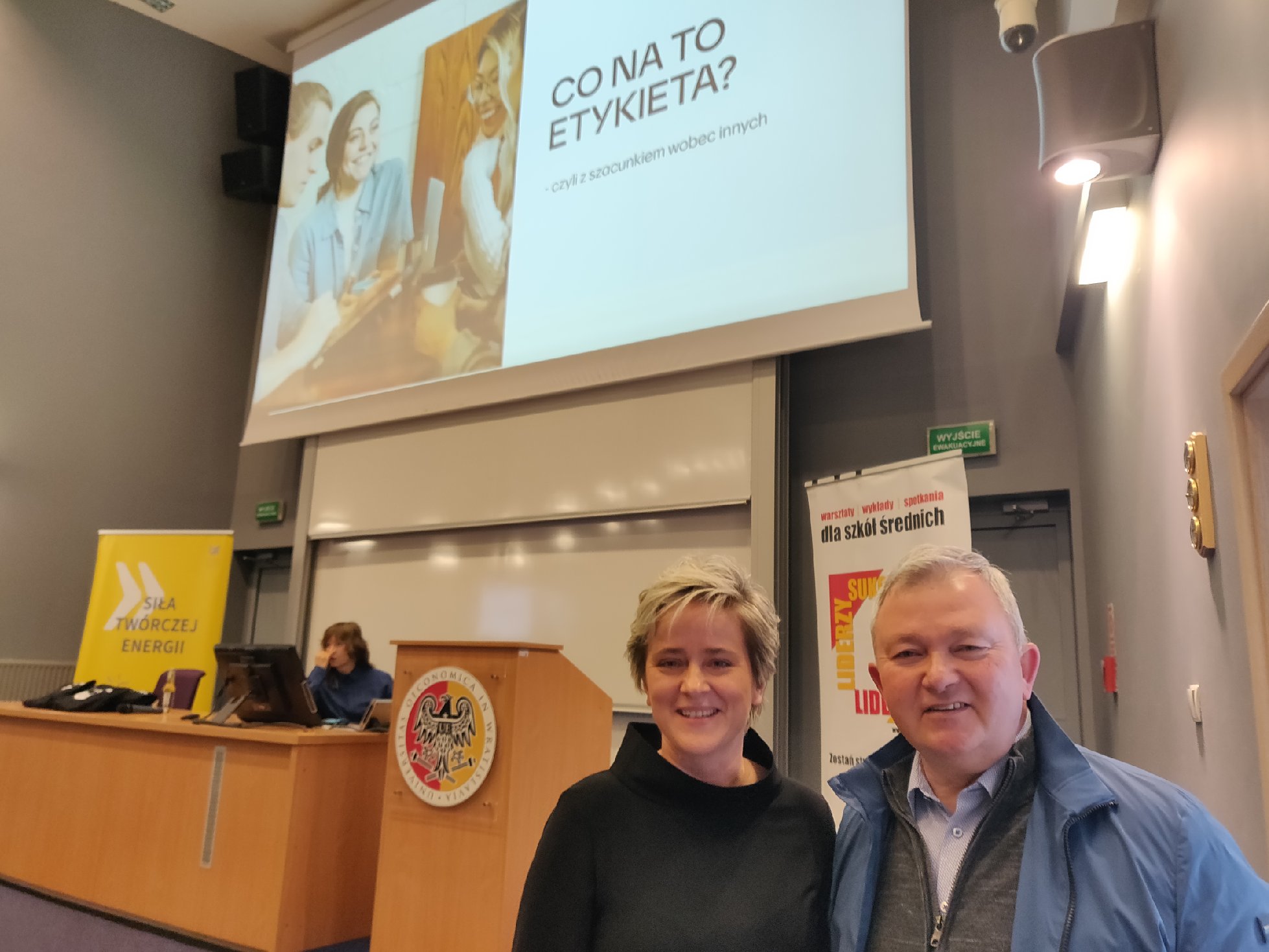 Temat otwartego wykładu: „CO NA TO ETYKIETA- czyli z szacunkiem wobec innych”. A sam wykład został rewelacyjnie zaprezentowany przez Dyrektora Centrum Kształcenia Ustawicznego UEW Panią dr Sylwię Wronę oraz dwie asystentki. Elementem, który uatrakcyjnił wykład był 4-częściowy „Quiz z etykiety” dla uczestników. Pani Profesor bardzo szybko nawiązała kontakt z uczestnikami wykładu, a następnie bardzo atrakcyjnie wyjaśniała zawiłe reguły i zasady savoir-vivre w kontaktach towarzyskich i biznesowych. Przykładowe zagadnienia: powitania osób, przedstawianie osób, wymiana wizytówek, konsumpcja na przyjęciu, zasady pisania wiadomości mailowych. Wykładowczyni kilkukrotnie przypominała, że stosowanie zasad savoir-vivre to głównie okazywanie szacunku innej osobie, podnoszenie efektywności relacji z innymi i budowanie naszego pozytywnego wizerunku. Ciekawie prowadzony wykład i włączanie uczestników do zabawy w rozwiązywaniu zadań Quizu zaowocowały: autentycznym zainteresowaniem uczniów, sportową rywalizacją w walce o upominki, pozostawieniem miłych refleksji i wniosków do praktycznego stosowania. Organizatorzy wykładów zapowiadają kontynuację projektu w kolejnym roku akademickim. Warto skorzystać z oferty Uniwersytetu Ekonomicznego we Wrocławiu.