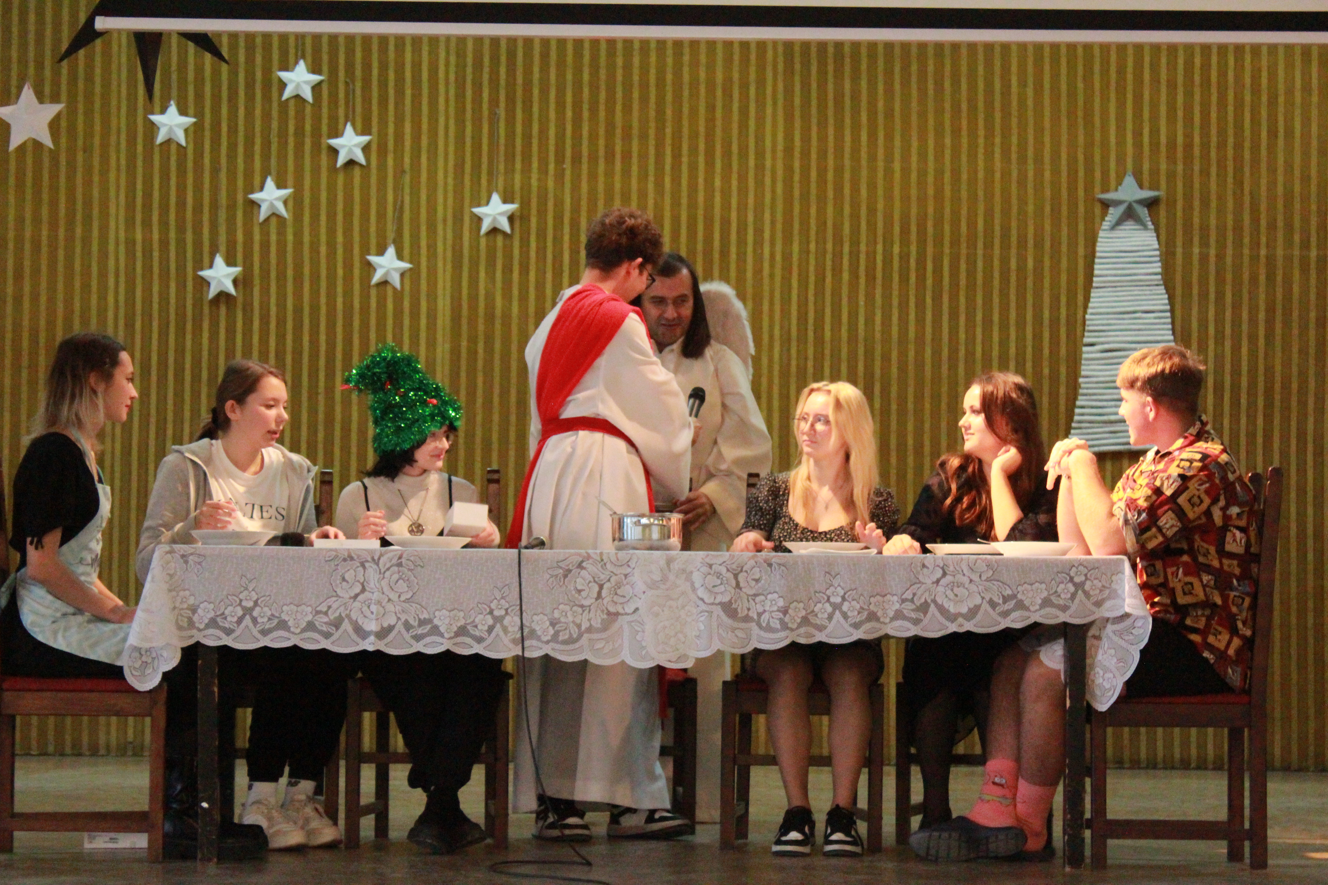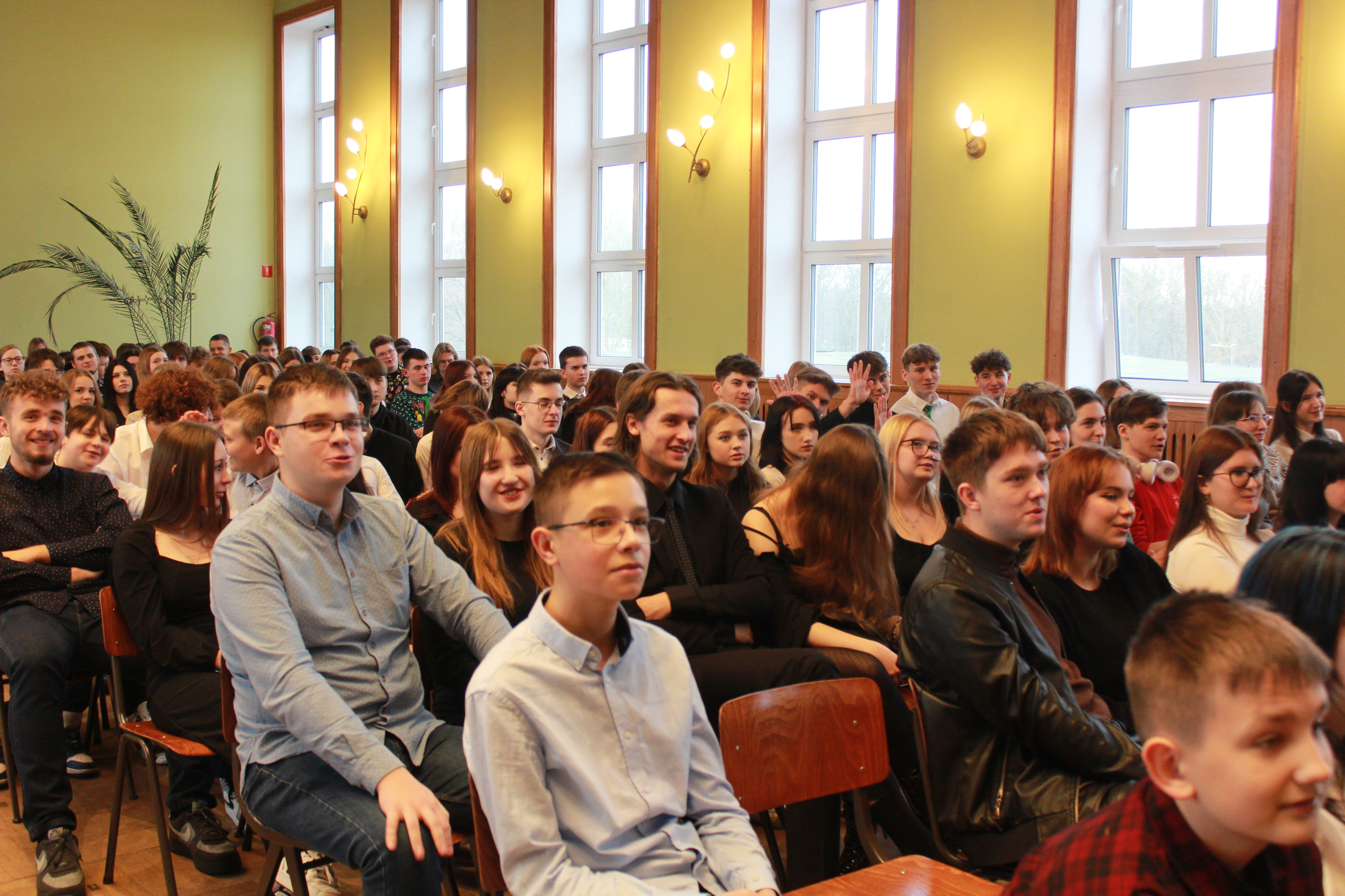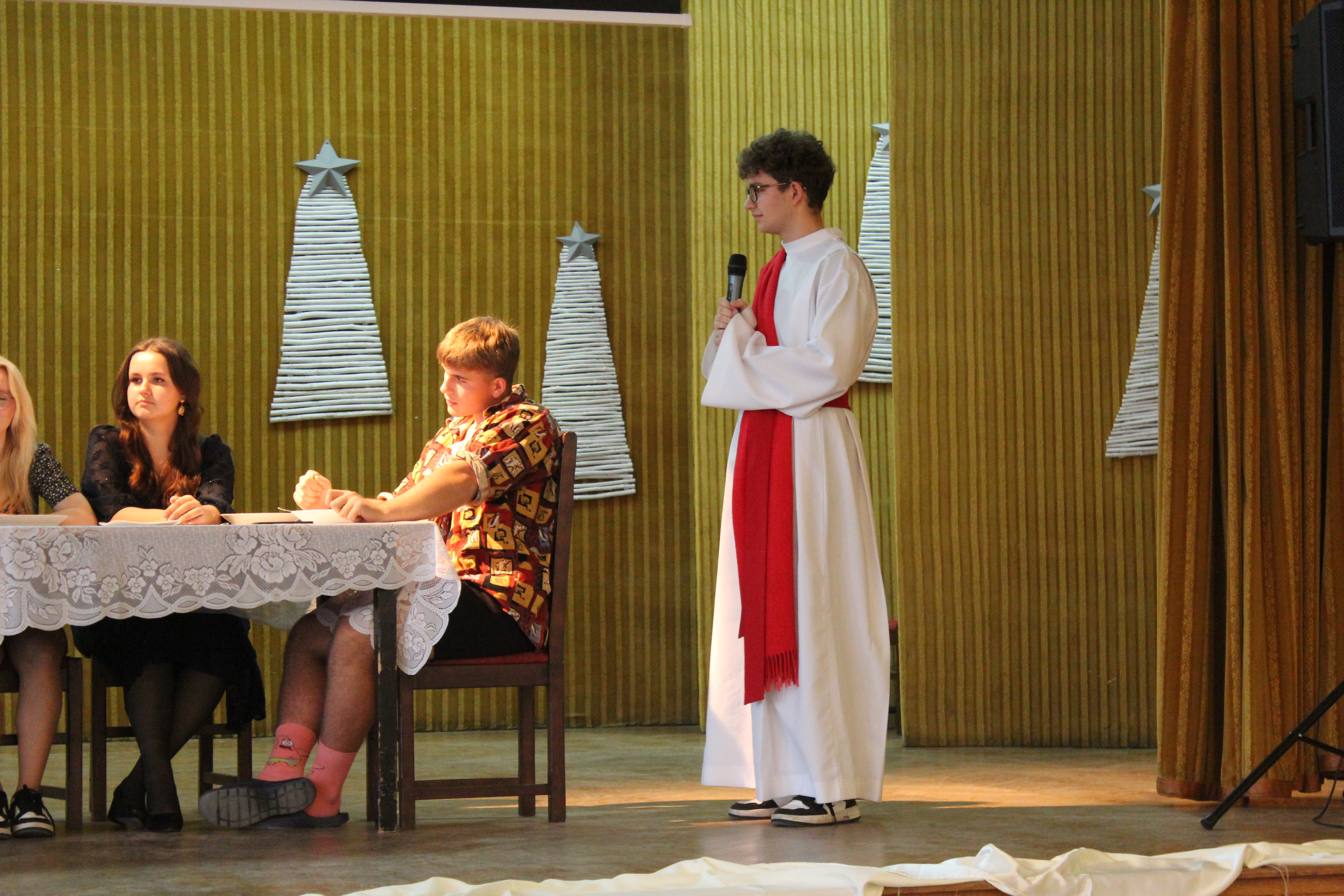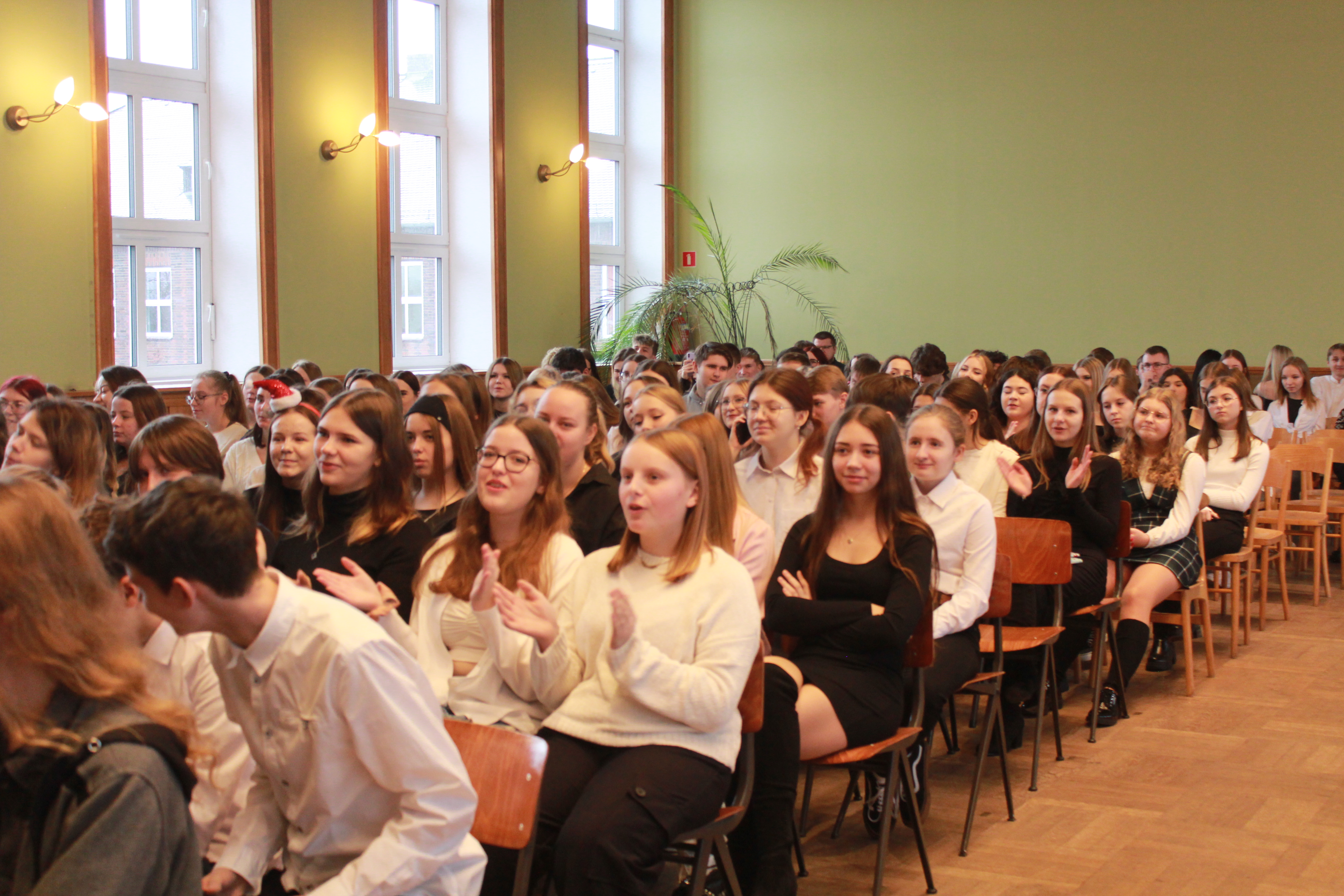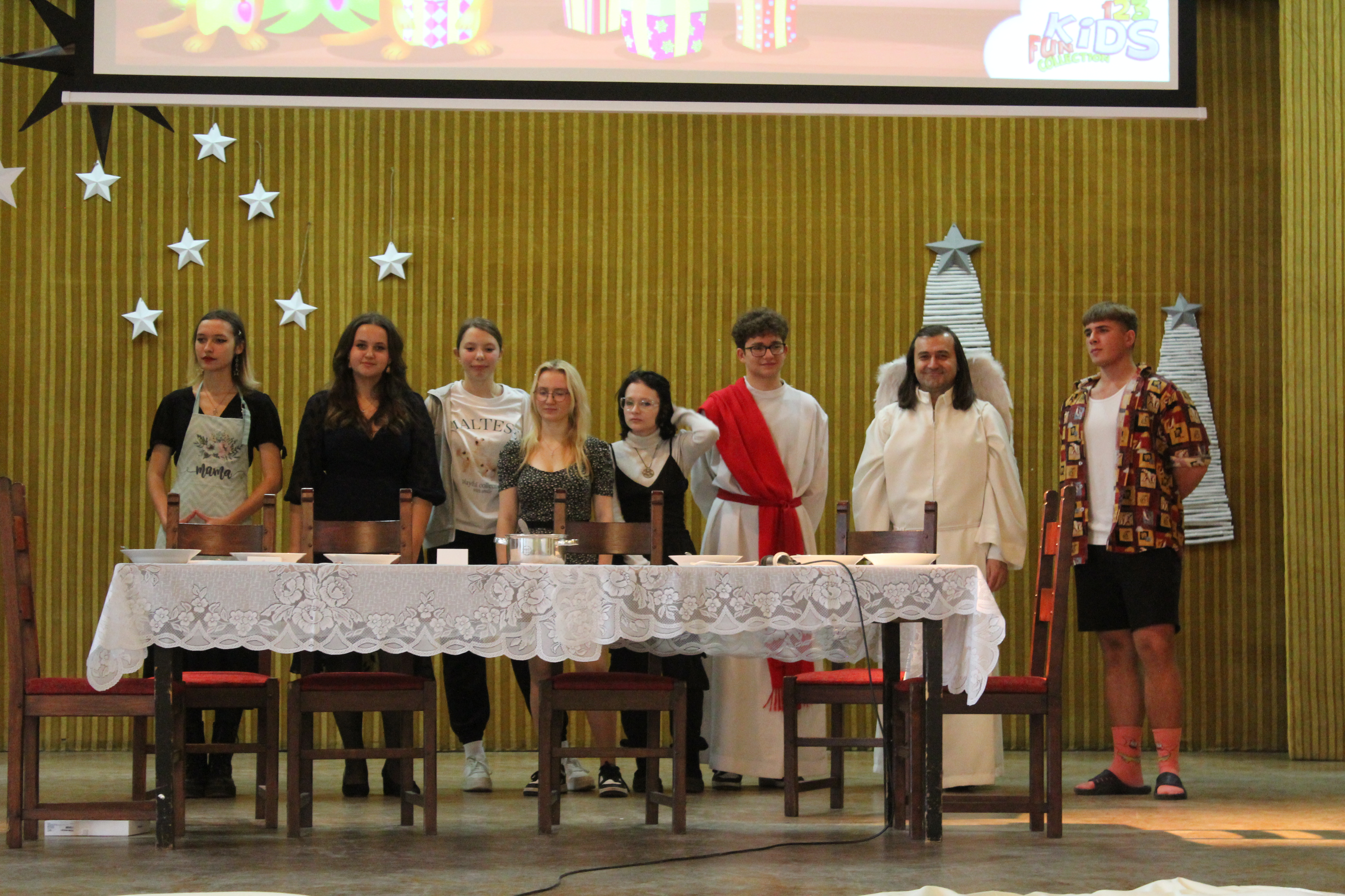 Rano część młodzieży udała się do kina aby obejrzeć film „Raport Pileckiego”. Po zakończeniu projekcji cała społeczność szkolna udała się do auli na przedświąteczne spotkanie, Główną jego część wypełnił spektakl w reż. ks Łukasza. Widowisko skłoniło nas wszystkich do radosnego spędzenia Świąt Bożego Narodzenia w rodzinnym gronie przy wigilijnym stole i śpiewaniu kolęd.